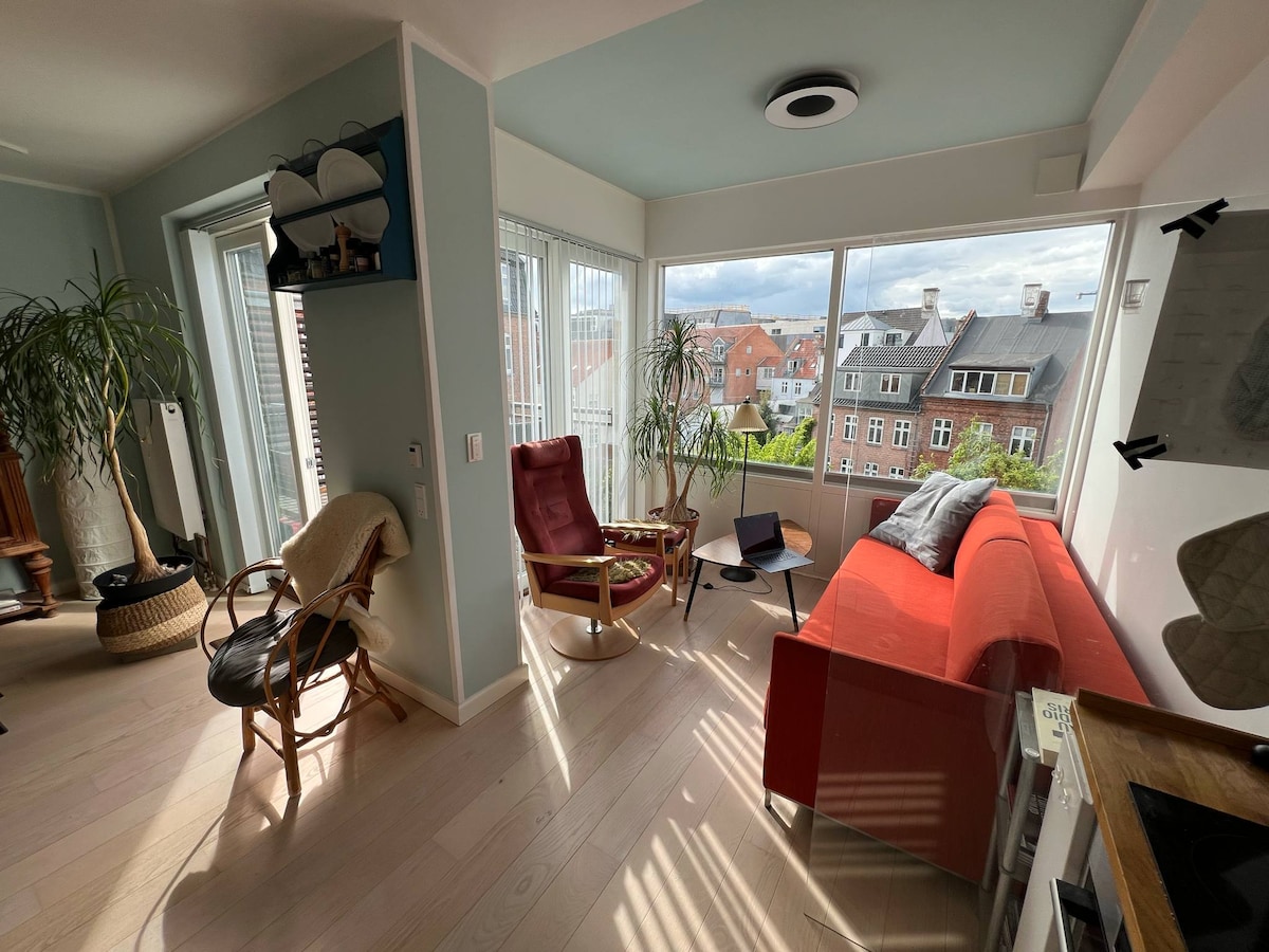 2 værelses charmerende og meget hyggelig lejlighed på 4.sal i hjertet af Aarhus, midt i øgaderne med den smukkeste udsigt over hele Aarhus. Butikker, caféer, Botanisk have, skov og strand i en radius af 500m. I lejligheden er der et hyggeligt køkkenalrum og en kombineret stue/soveværelse. Sengen er 140cm bred. Privat værelse på 5.sal uden adgang. Der er TV og wifi. Lejligheden passer perfekt til parret eller en single der vil opleve Aarhus indenfor gåafstand.