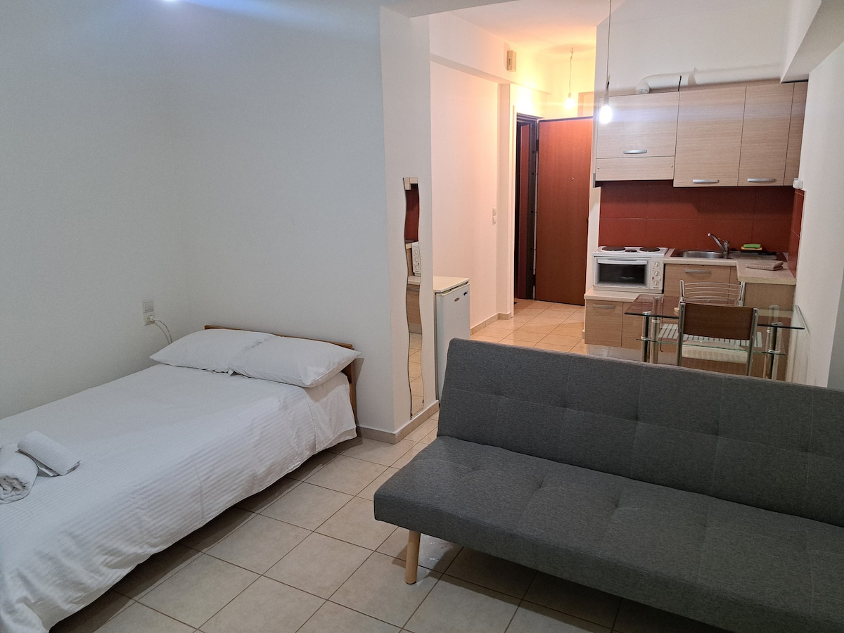 Numru tar-Reġistrazzjoni 00001558460 Studio modern b' kamra waħda fiċ-ċentru tal-belt f' post kwiet u eċċellenti qrib ħafna tal-Marina, ħmistax-il minuta mixi 'l bogħod mill-Pjazza Georgiou, b' ġnien privat u parkeġġ privat li jakkomoda b' mod komdu tliet persuni, b' kapaċità sa 4 persuni (sodda doppja u sufan sodda għal tnejn) iżda jillimita l-ispazju, f' bini ta' għaxar snin li jissodisfa r-regolamenti antisismiċi moderni kollha b' wifi bla ħlas, arja kkundizzjonata.