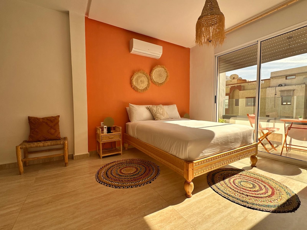 Tamraght għandha dak kollu li teħtieġ biex tqatta' ftit jiem hemmhekk waqt li tkun qed tesplora l-Marokk jew biex tqatta' l-vaganza kollha hemmhekk. Dan l-appartament privat jinsab idealment u fiċ-ċentru fil-qiegħ ta' Tamraght; mixja ta' 5 minuti sal-bajja b' kundizzjonijiet tas-surf għal-livelli kollha, u mixja madwar ir-rokna sa ħwienet, kafetteriji u ristoranti. Iż-żona tal-għajxien ħafifa u miftuħa u t-terrazzin privat huma perfetti biex tirrilassa, u għandek ukoll aċċess għat-terrazzin kbir (maqsum mal-oħrajn) fuq il-bejt b'deheb tax-xemx u veduti tax-xemx fuq l-oċean.