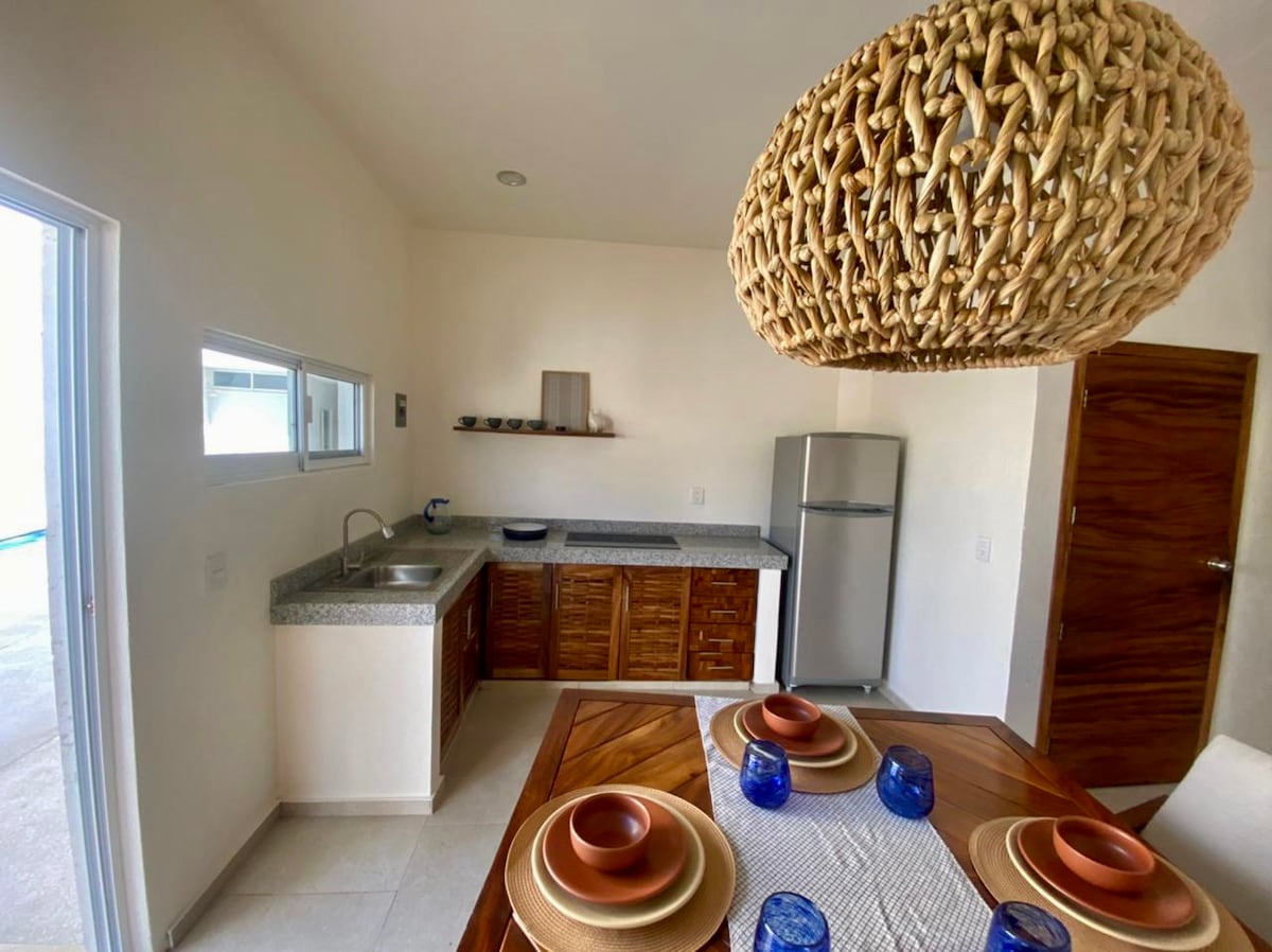 Relájate con toda la familia en este alojamiento donde la tranquilidad se respira. Departamento totalmente nuevo, ideal para 2 adultos y 2 menores, cuenta con una cama King size y un sofá cama. Se cuenta con lavadora y secadora en común en la tercer planta. Las palapas están disponibles como área de esparcimiento.