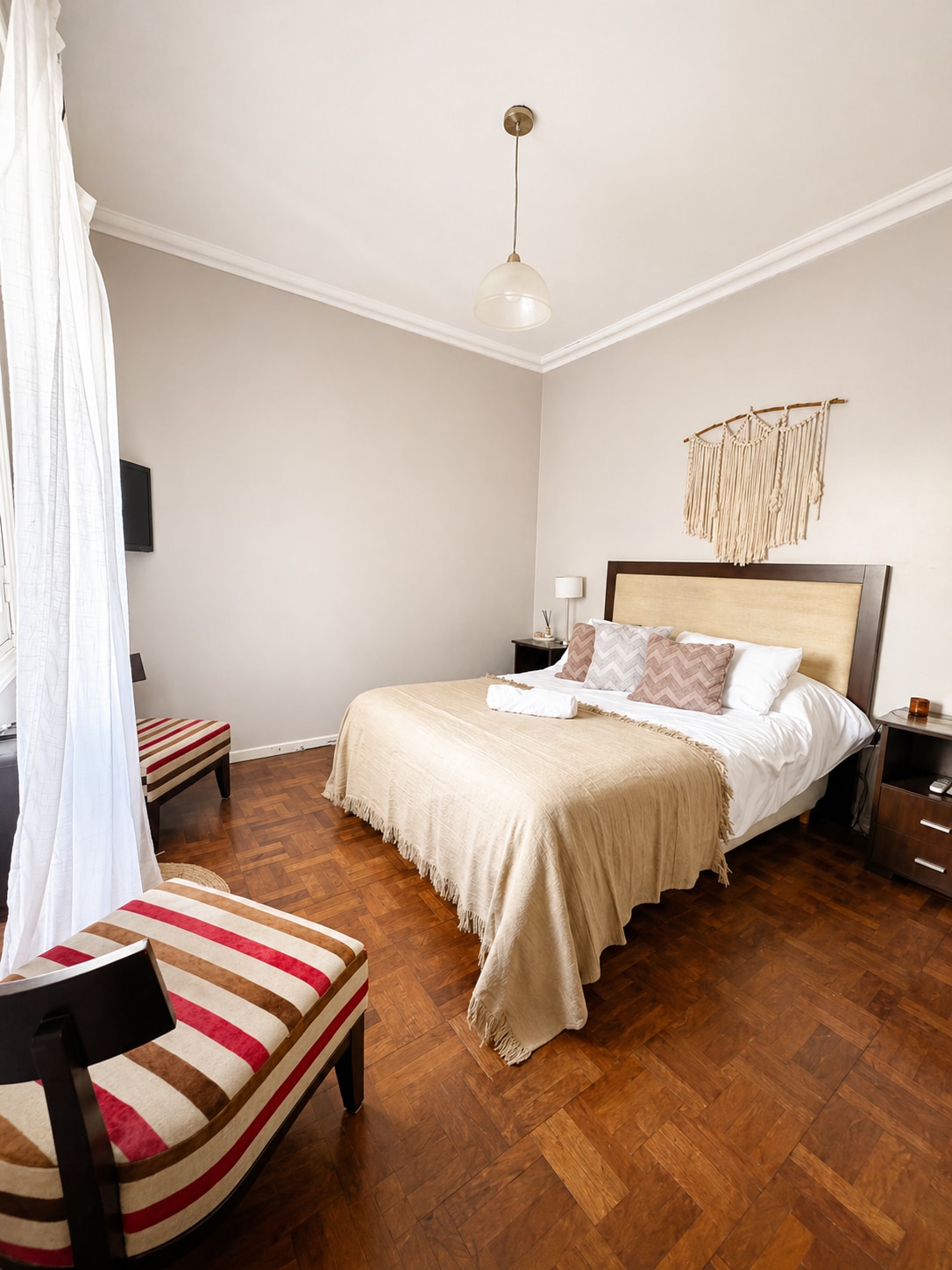 Merħba f' dan l-appartament modern u spazjuż fiċ-ċentru ta' Junín! B' żewġ kmamar mdawla, waħda b' sodda kbira u waħda b' żewġ sodod doppji, hija ideali għall-gruppi jew għall-familji. Il-kamra tal-banju hija spazjuża u l-kċina-kamra tal-ikel mgħammra b' kollox għall-kumdità tiegħek. Minuti 'l bogħod mir-ristoranti, in-negozju u l-attrazzjonijiet, se jkollok dak kollu li teħtieġ biex tgawdi minn Junín. Nisperaw li tgawdi ż-żjara tiegħek!
