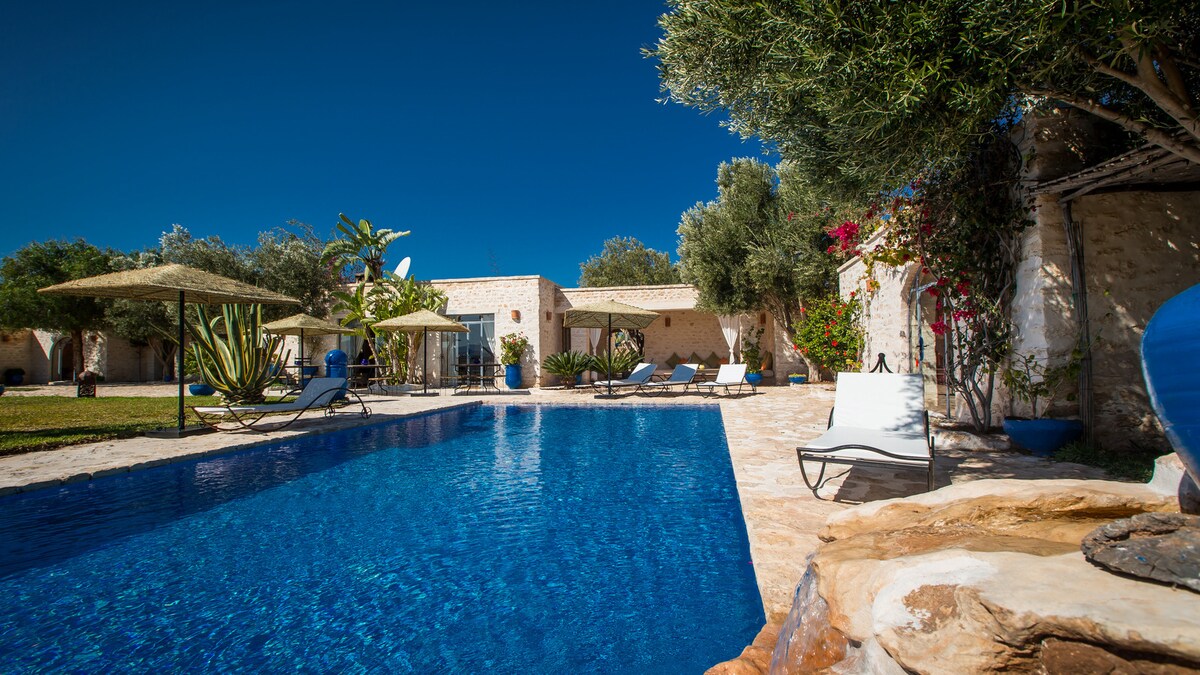 Villa tal-Familja mill-isbaħ, b' 2 livelli, indipendenti, spazjuża, imdawla sew, pixxina privata kbira ta'75m ² u ġnien sabiħ. Tinsab fil-kampanja, 16 km 'il bogħod minn Essaouira fuq Sidi Kaouki rd, għandha finitura lussuża, ċmieni, post b' nar miftuħ fil-ġnien, siġar taż-żebbuġ u tal-frott u żewġ Terrazzin sbieħ bil-pergoli. Moderni u paċifika. Ajruport f' 6.5 km u ħwienet u supermarket f' 10 minuti. Se jkollok bżonn vettura biex tmur minn post għall-ieħor.
