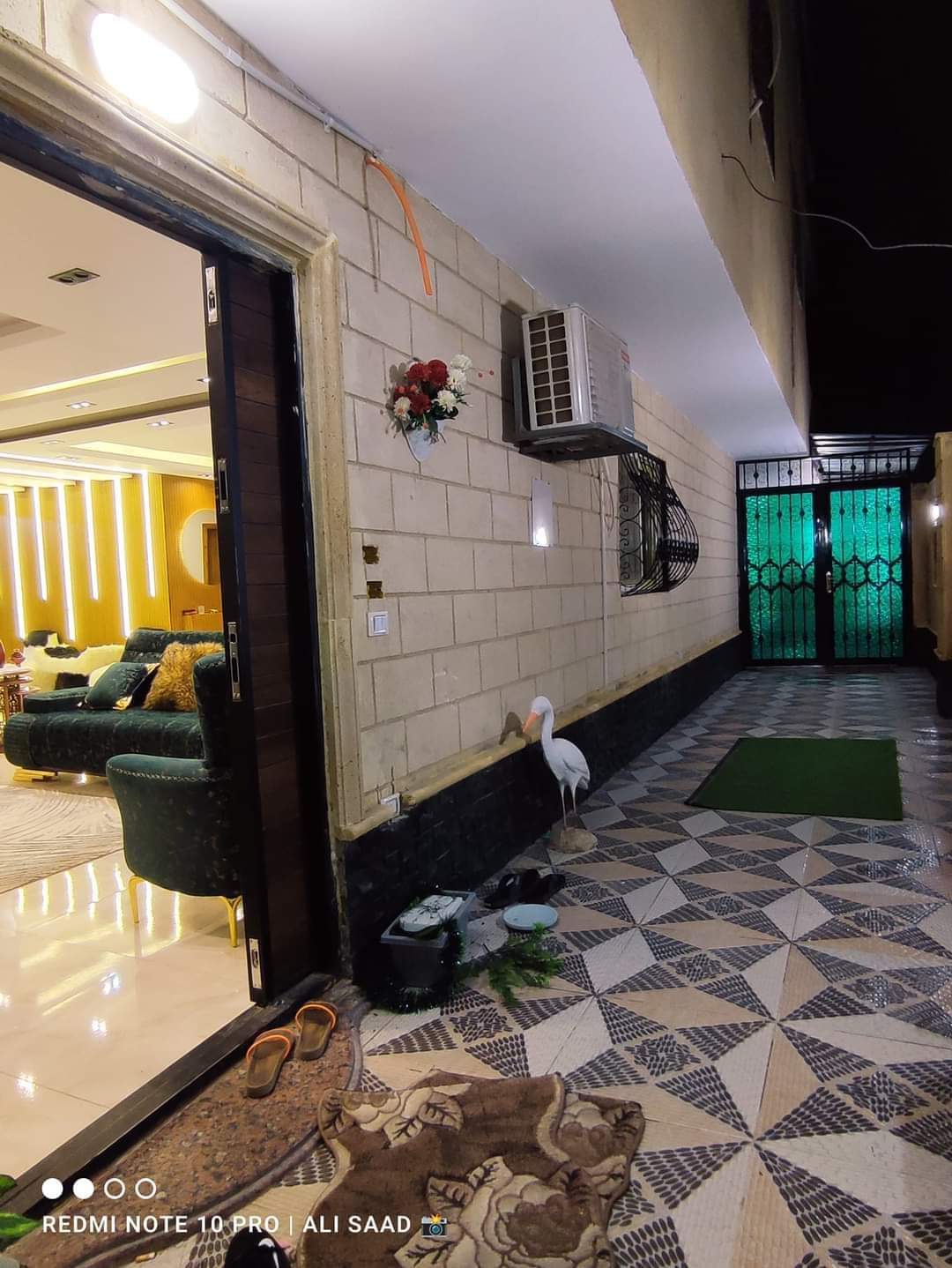 🌿 Welcome to the Pharaonic Ancient Egypt Doorway Step inside to warm wooden floors and rustic arched doors, setting a cozy, inviting tone. The living room blends modern and boho styles, with a chic TV stand with woven rattan and a lush indoor plant adding greenery. Intricate pink and beige patterned wallpaper decorates the walls, giving the space a stylish and artistic character—perfect for a relaxing stay.