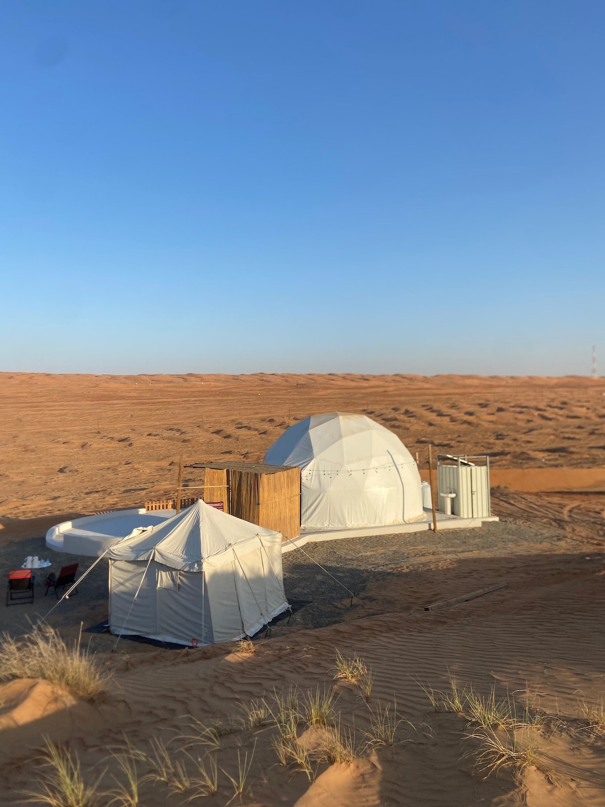 خيمة خاصة وفاخرة في قلب صحراء بدية 🌵✨ استمتع بتجربة هادئة وفريدة في خيمتنا الخاصة Private VIP Tent in the Desert، حيث الهدوء التام والخصوصية الكاملة — لا يوجد أحد بجوارك سوى سكون الصحراء وجمال الكثبان الرملية. في الليل، يمكنك مشاهدة النجوم بوضوح مذهل تحت سماء صافية خالية من أضواء المدن 🌌. الخيمة مجهزة بأحدث المرافق الحديثة والمريحة، لتجمع بين سحر الحياة الصحراوية ورفاهية الإقامة الفندقية. إنها الخيار المثالي للاسترخاء، أو لقضاء وقت رومانسي، أو لتجربة أصيلة في قلب الصحراء.