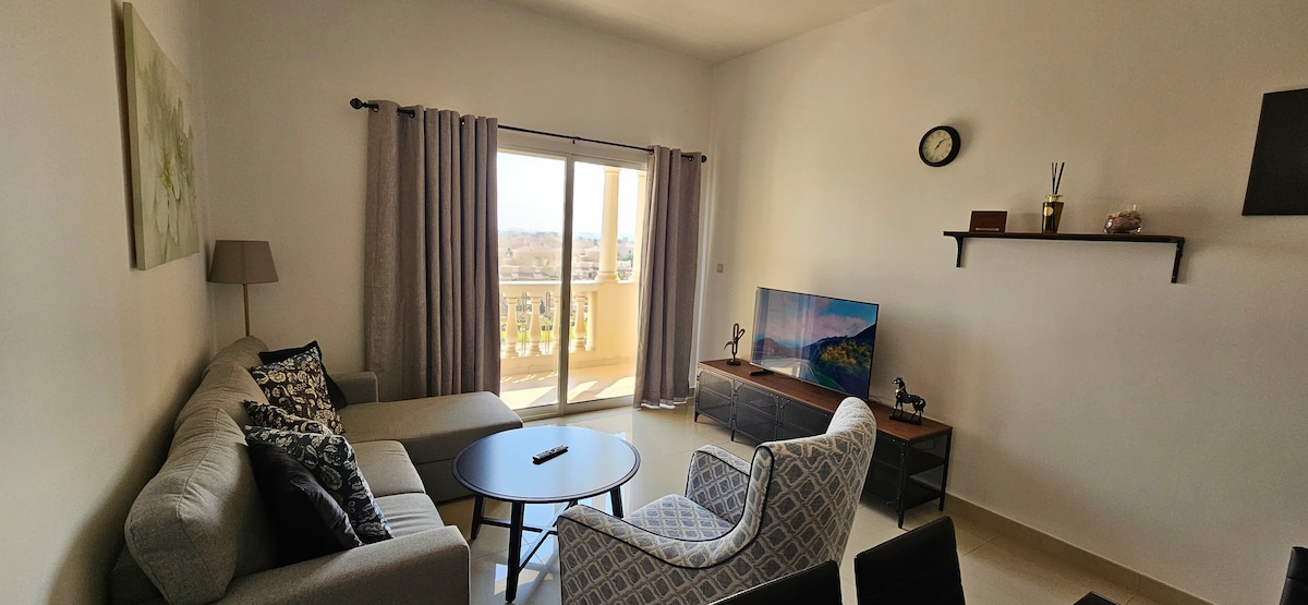Suite kompletament rinnovata b 'pass wieħed mill-Bajja bla ħlas, mill-korsa tal-golf, il-Marina u qrib il-lukandi lussużi Ritz Carlton, Waldorf, Hilton. 20 m. sewqan lejn il-Muntanji Hajar. Aċċess għal concierge/lockbox ta '24 siegħa. Parkeġġ bla Ħlas. Bla ħlas: Gym, pixxina , pixxina għat-tfal u 2 żoni tal-logħob għat-tfal. Terrazzin kbir sabiħ b 'salott fejn toqgħod bilqiegħda u b' veduta sħiħa tal-baħar. Irqad: sodda doppja 'King' + 2 sufani sodda. Kċina: cooker, w/machine, friġġ, Nespresso, toaster. Oħrajn: Wifi, 55' Smart TV , Netflix, xugamani tal-baħar, umbrella