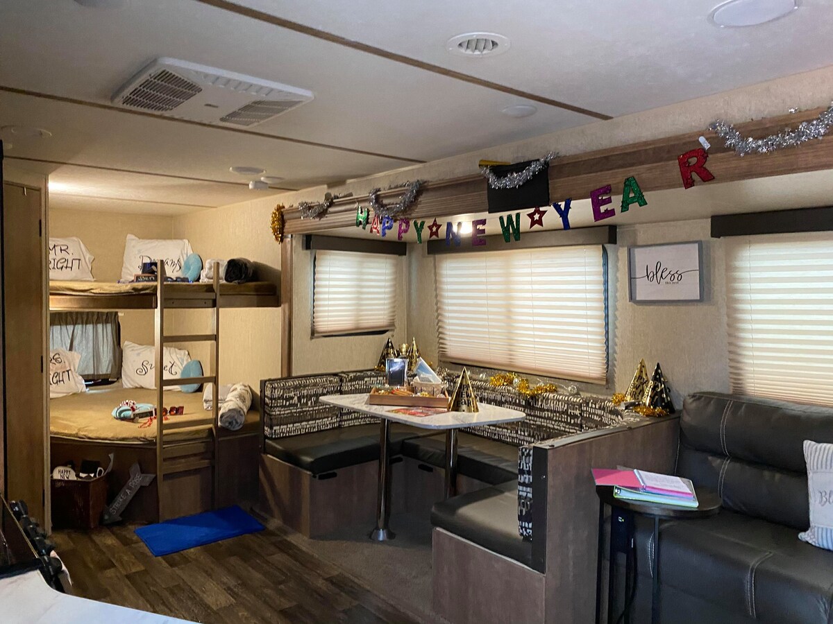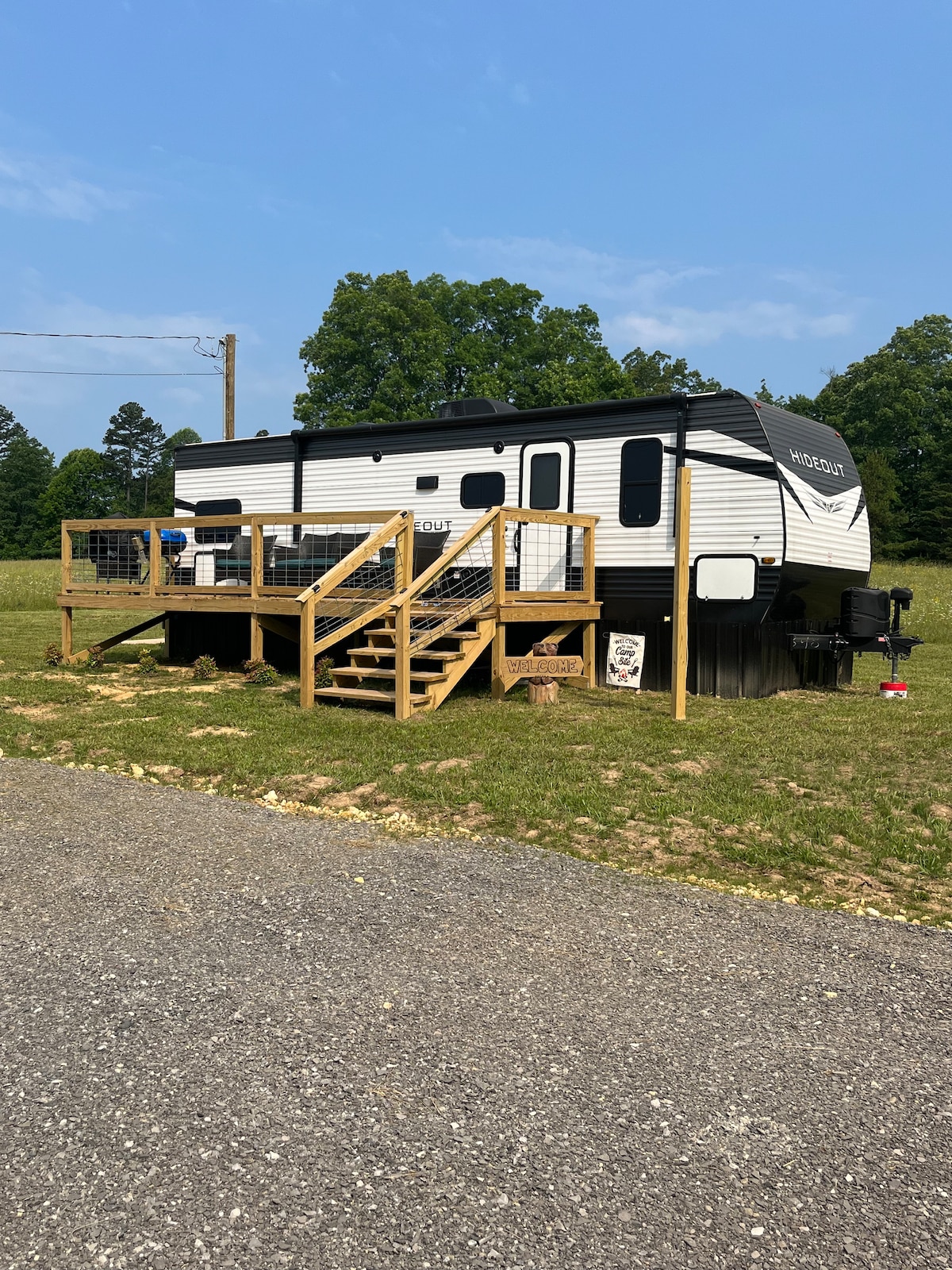 Il-kamper tagħna ta ’27 pied' Heartland Sundance huwa mħejji għall-klijenti fuq lott żgħir fuq quddiem tal-propjetà tar-razzett tagħna. Il-klijenti se jkollhom veduta mill-aqwa tal-mergħat tagħna bil-merħla żgħira ta' baqar u żwiemel tagħna. Din iż-żona hija mħejjija għal esperjenza ta' glamping. Dan jinkludi fossa tan-nar, siġġijiet u grill ta' barra. Il-kamper għandu kamra tas-sodda ewlenija waħda, 2 bunk beds doppji, il-mejda u s-sufan jikkonverti f 'sodod ukoll. Dan il-kamper huwa wieħed minn 2 kampers li issa huma disponibbli fir-razzett tagħna.