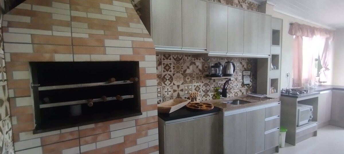 Casa sobrado, com dois quartos, sendo um quarto de casal com ar condicionado e outro quarto de solteiro com ventilador, sala de estar com lareira, cozinha conjugada, semi mobiliada, com fogão, chaleira elétrica, microondas, air fray, geladeira, possui dois banheiros e tem estacionamento gratuito.