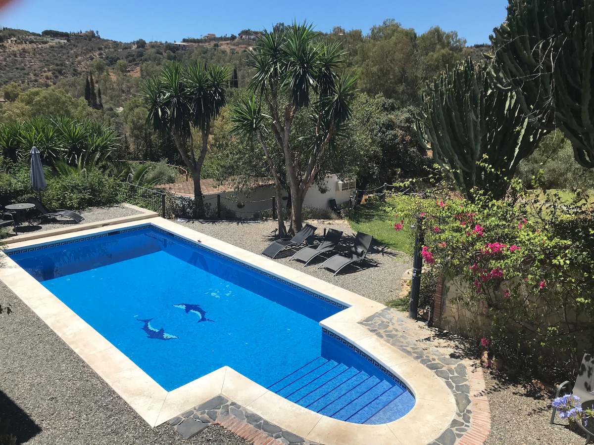 Villa lussuża b 'pixxina privata, ġonna fuq barra u barbikju, mejda tal-ping pong. Magħmul minn suite waħda b 'sodda King Size u banju idromassaġġ, suite waħda b' sodda 150x200, flimkien ma' 2 kmamar tas-sodda b' 105x190 sodod doppji, 3 kmamar tal-banju sħaħ, tojlit, salott kbir u kċina. Mgħammra bil-wifi u bit-televiżjoni bis-satellita. Imsaħħna kompletament. Jinsab f 'ambjent naturali f' qiegħ il-medda tal-muntanji Alhaurín el Grande. 20 min. mill-ajruport ta' Malaga, mill-aqwa bajjiet ta' Costa del Sol.