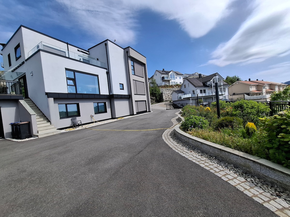Merħba fl-appartament tal-art f' dar moderna f' Knarvik, fil-periferija ta' Bergen. Dan l-appartament huwa mgħammar b' tojlit intelliġenti fil-kamra tal-banju, termostat tat-temperatura u arja kkundizzjonata fil-kmamar kollha. Żewġ postijiet għall-parkeġġ huma disponibbli għall-vetturi tal-klijenti. Dal-post għandu post komdu. - 30 minuta sewqan saċ-ċentru ta' Bergen - Knarvik AMFI Shopping Center , Knarvik Bus Terminal u stazzjonijiet tal-iċċarġjar tal-vetturi elettriċi, 15-il minuta bil-mixi, 5 minuti sewqan.