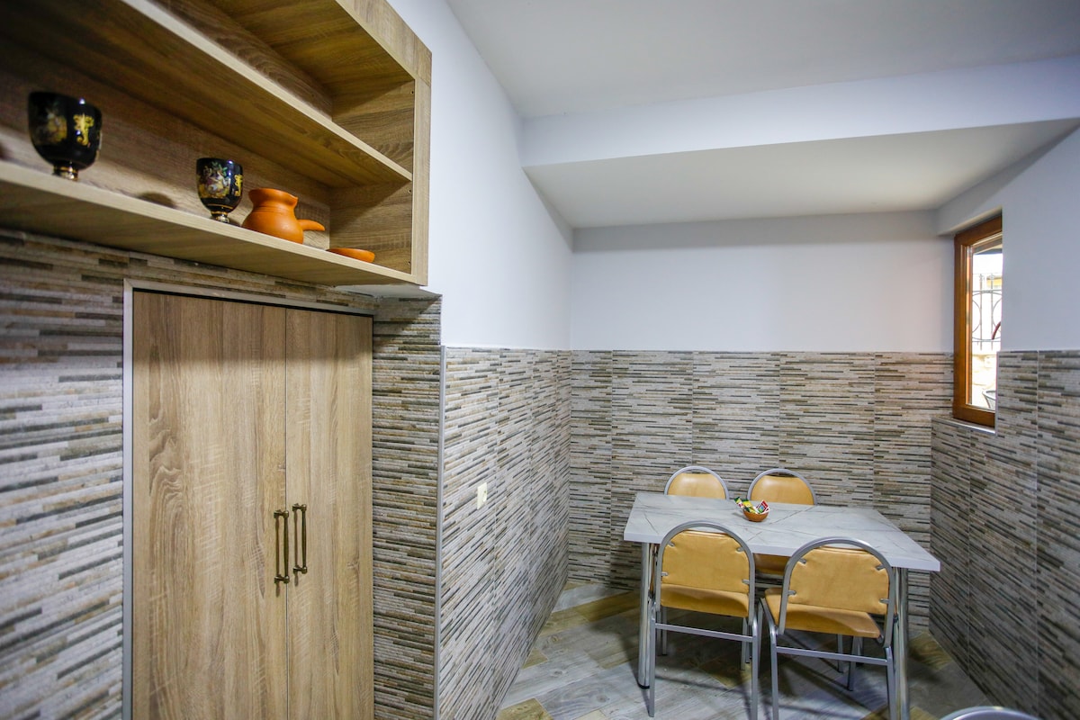 L-appartament jinsab fiċ-ċentru tal-belt,L-aħjar post ġewwa Kutaisi. Għandha żewġ kmamar tas-sodda(Sodda kbira fit-tnejn),Salott, kċina, kamra tal-banju u bitħa kbira. It-tarzna hija protetta minn kameras tas-sigurtà.,Tista 'tipparkja l-karozza tiegħek fit-tarzna. L-appartament jista' jakkomoda 5 persuni(Is-sufan fil-collapses tas-salott). Kollox huwa għalik biss. Hemm tisħin ċentrali u arja kkundizzjonata.