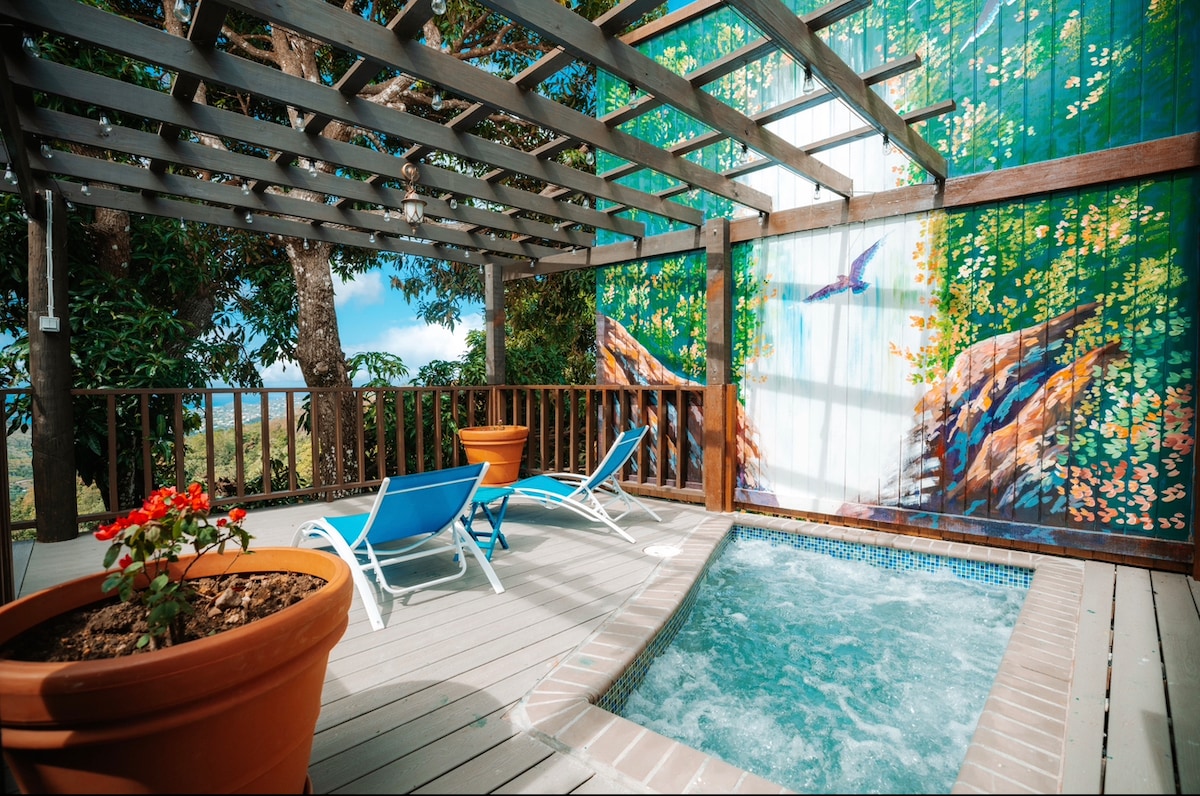 Iż-żjara tiegħek f' din in-natura, romantika fil-miftuħ, 2 kmamar tas-sodda, 2 vilel bit-treehouse tal-banju tpoġġik quddiem u fiċ-ċentru f' waħda mill-aqwa żoni ġewwa St. Lucia. Hawnhekk tista' tmur torqod u tqum għal veduta ta' 180 ta' Pitons mill-isbaħ u l-oċean tal-Karibew. Din il-villa tinsab f' żona ewlenija, eżatt 'il fuq mit-triq minn Jade Mountain Resort u l-bajja ta' Anse Chastanet, għandha kollox - post, kumdità, romanza, avventura u natura.