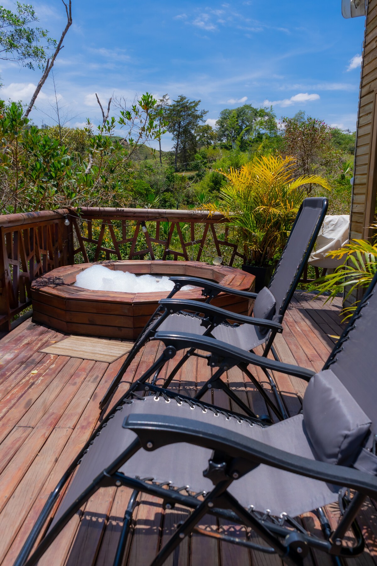 Rainforest Refuge Chalet in Guarne, Antioquia, Medellín, surrounded by majestic mountains and the soothing sounds of birds and butterflies. Enjoy breathtaking sunrises and reconnect with nature from our cozy cabin's spacious deck, where you can sip coffee and take in stunning views. Inside, a glass-ceiling bathroom invites you to unwind while the fully-equipped kitchenette enhances your stay. With outdoor furniture for al fresco dining and serene paths to explore, you’ll feel in heaven!