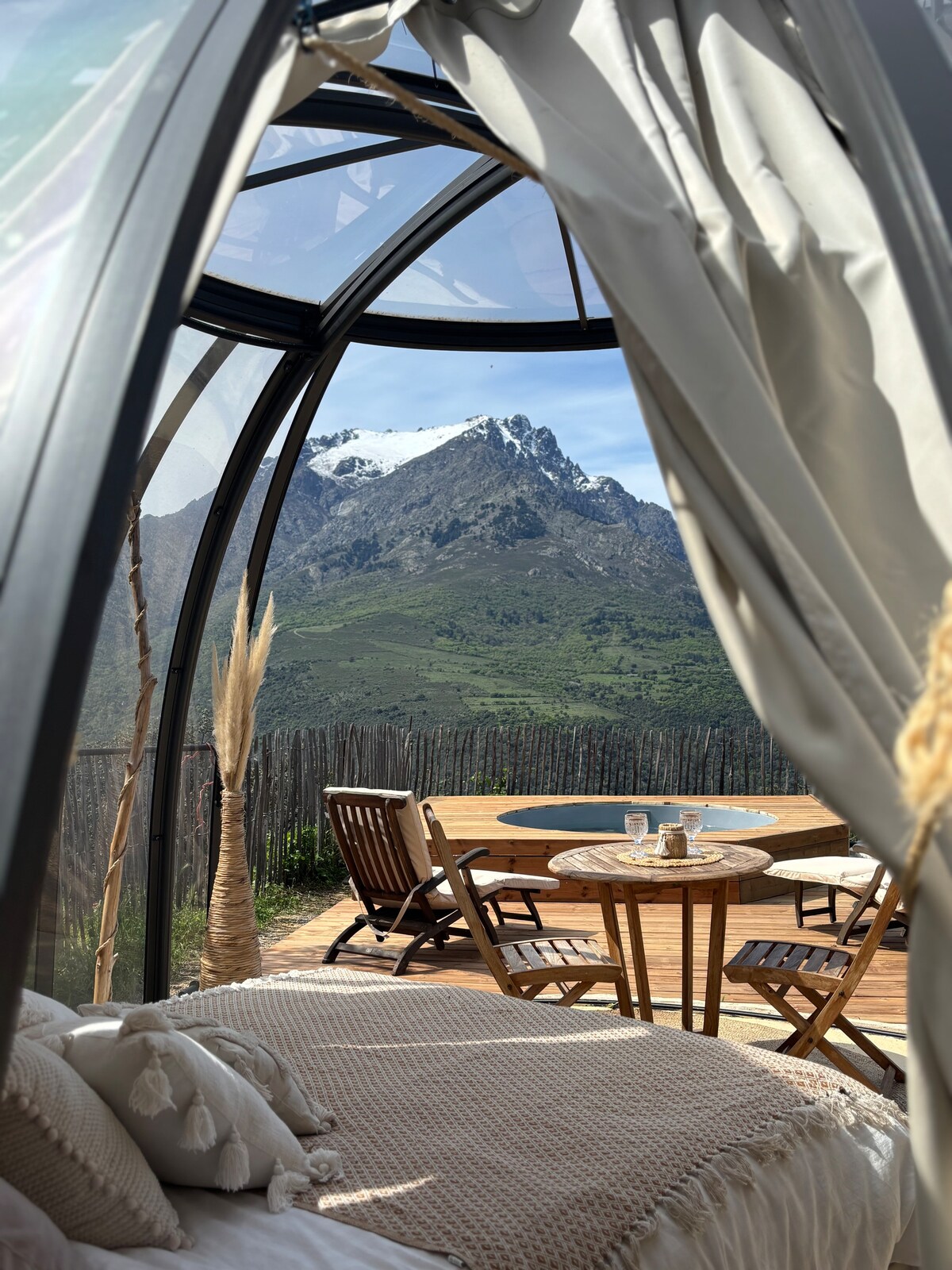 Envie d'être en accord avec la nature et de changer du logement standard ? Vous avez sonné à la bonne porte ! Imaginez vous dans la forêt en pleine montagne corse, profitant de la terrasse de 40m2 pour admirer le couché de soleil en prenant un petit apéritif, puis d'aller se coucher dans un lit confortable en admirant le ciel étoilé grâce à ses ouvertures au plafond. Les ouvertures sont équipées de moustiquaires afin de vous garantir une nuit paisible tout en profitant de la douceur nocturne.
