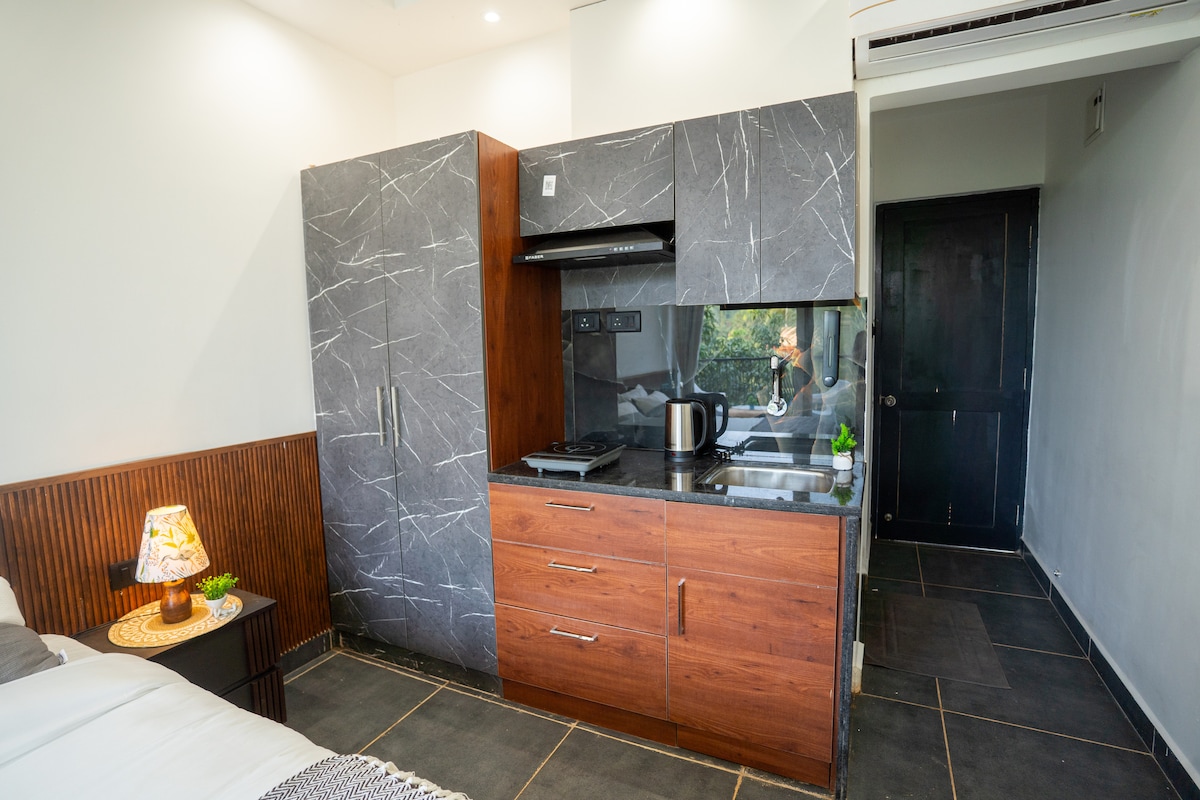 This is a peaceful and centrally-located place. Unwind in your own modern studio at our Mandrem retreat. Apartment has a kitchen, cozy balcony, and access to a refreshing pool. Our 24/7 reception and laundry service make your stay effortless. Just 10 minutes from Mandrem Beach and surrounded by Goa’s best cafés, this peaceful stay blends comfort, convenience, and a relaxed tropical vibe. We do not have the government-mandated license to host foreign nationals; bookings will be asked to cancel