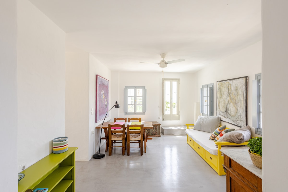 Id-dar Ċikladika maħsula bajdani tinsab fil-periferija tal-insedjament tradizzjonali ta 'Chora f' Amorgos u tipprovdi kemm privatezza massima kif ukoll aċċess faċli għall-parkeġġ u ċ-ċentru tar-raħal f' mixja ta' 5 minuti biss. Il-klijenti tagħna se jgawdu veduti bla xkiel tal-imtieħen tar-riħ, il-baħar u nżul ix-xemx mill-isbaħ, iżda wkoll veduti panoramiċi tar-raħal u l-kastell Venezjan tas-seklu 13 tiegħu. Il-propjetà tista 'takkomoda sa 6 persuni, u b' hekk tkun ideali għal familja jew grupp ta' ħbieb.