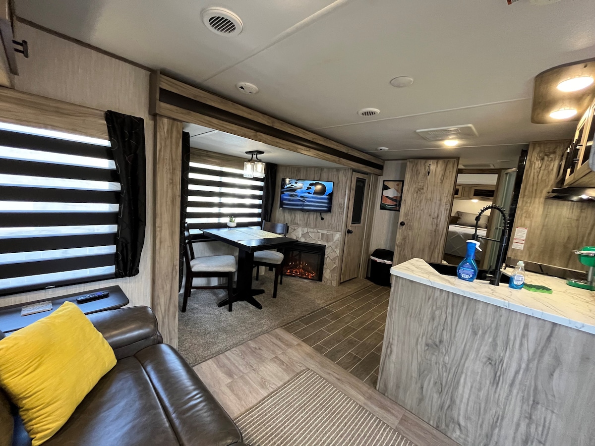 Welcome to our cozy glampsite village, where you'll be staying in this homey and charming 30 foot glamper named "Harmony". So get ready to pack your glamp bags, as the peaceful and serene Harmony awaits, to give you a private bedroom with queen-sized mattress, additional sofa bed, two recliner chairs, two tv's, wifi, full kitchen & dining and full bathroom. It’s perfect for a romantic getaway or a fun trip with a couple of friends. Outside, enjoy the hammock chair, fire pit and games. 💚