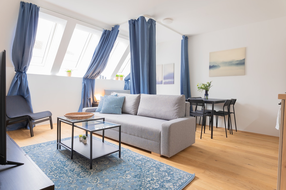 Idħol fil-kumdità tal-appartament eleganti tiegħek fuq il-bejt, imxarrab mix-xemx, b 'faċilitajiet eċċellenti fiċ-ċentru ta' Vjenna. Ftit passi biss 'il bogħod mix-Xmara Radetzkyplatz u Danubju vibranti, l-appartament iwiegħed irtir urban, distanza bil-mixi sal-aqwa ristoranti, ħwienet, attrazzjonijiet u punti ta' interess tal-belt. Vjenna awtentika li tgħix fl-aħjar tagħha! Sodda ✔ King + Sufan Sodda Żona ✔ ta 'Għajxien tal-Pjan Miftuħ ✔ Kċina Mgħammra Kompletament Gallarija ✔ Privata ✔ Smart TV ✔ Veloċità għolja Wi-Fi ✔ Arja Kkundizzjonata Aqra iktar ↓