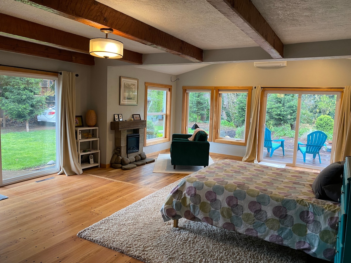 Studio ħafif u jgħajjat b 'loft tal-irqad tat-tieni storja fi triq miksija bis-siġar fil-viċinat popolari ta' Jefferson Westside. Perfetta għal 1-2 klijenti. Id-distanza tal-mixi lejn varjetà ta 'ħwienet tal-ikel, kafetteriji, dispensarji u birreriji. Aċċess rapidu għall-Università ta 'Oregon, il-Qasam ta' Hayward u ċ-ċentru ta 'Eugene. L-istudjo huwa mehmuż mad-dar prinċipali iżda għandha daħla privata u joffri kuntatt b' xejn check in. Sodda queen, kamra tal-banju u kċina sħiħa kif ukoll wifi, AC u parkeġġ bla ħlas fuq wegħda