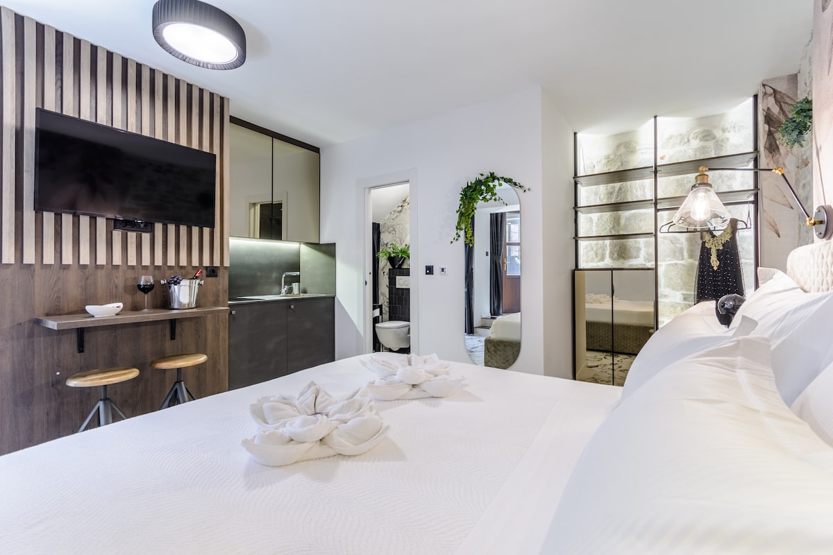 L-appartament tal-istudjo sabiħ tagħna b 'terrazzin privat kbir, li jinsab fil-Palazz ta' Diocletian, joffri veduta aqwa tat-torri famuż tal-qanpiena ta 'Saint Domnius. Ma setax ikun hemm post aktar ċentrali u meraviljuż minn dan.