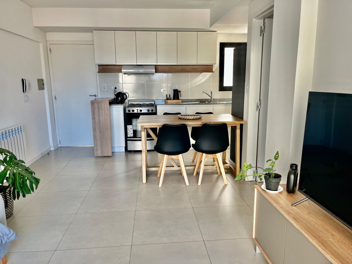 Merħba f' dan l-appartament modern u spazjuż fiċ-ċentru ta' Junín! B' żewġ kmamar mdawla, waħda b' sodda kbira u waħda b' żewġ sodod doppji, hija ideali għall-gruppi jew għall-familji. Il-kamra tal-banju hija spazjuża u l-kċina-kamra tal-ikel mgħammra b' kollox għall-kumdità tiegħek. Minuti 'l bogħod mir-ristoranti, in-negozju u l-attrazzjonijiet, se jkollok dak kollu li teħtieġ biex tgawdi minn Junín. Nisperaw li tgawdi ż-żjara tiegħek!