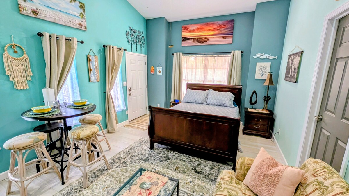 Dan l-appartament ta 'studio arjuż huwa inqas minn minuta mixi' l bogħod mill-bajja u huwa mgħammar b 'saqqu ta' daqs ta 'queen. L-istudjo huwa mgħammar b 'magna tal-ħasil/dryer, dishwasher, cooktop b' 2 berners, u appliances tal-azzar li ma jsaddadx. L-ispazju fuq barra jinkludi terrazzin mgħotti b 'mejda u siġġijiet u terrazzin komuni miksi b' żona. Siġġijiet tal-baħar u xugamani tal-baħar ikkuluriti disponibbli f 'kull unità. Mil' il bogħod miċ-ċentru ta 'Cocoa Beach ristoranti u ħwienet tax-xorb. Siegħa sewqan lejn l-Ajruport Internazzjonali ta' Orlando u l-parks tat-temi.