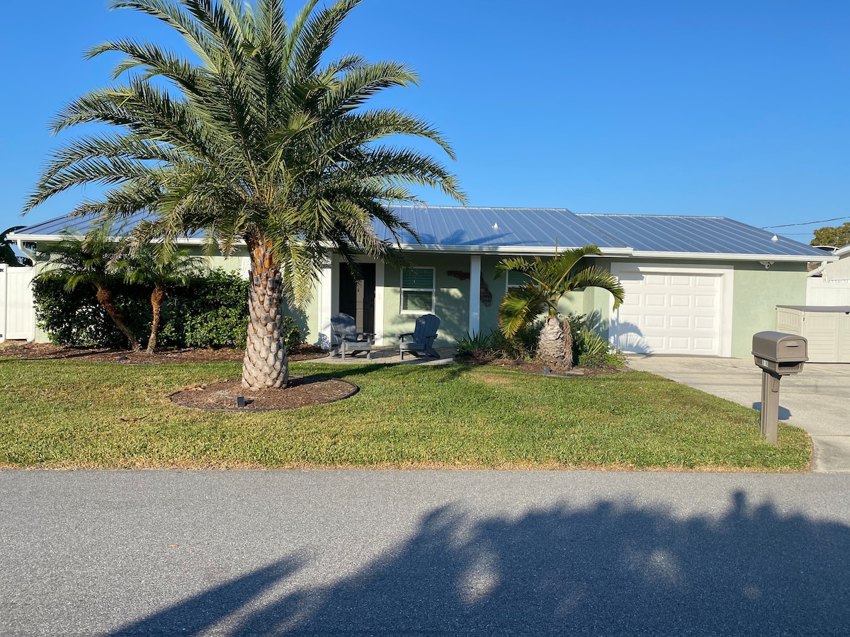 Rental space is private, downstairs only. Owner lives on-site in a separate upstairs unit. The house is configured as a duplex. The entire home is newly remodeled. Vintage mid-century modern, laid back cumfy beach style home. One short block walk to the beach, located riverfront with a pool in the backyard. Pool is gas heated upon request for a nominal charge. Private dock. 3 bedrooms available, two w queen bed, the other has a king. There is a fourth bed in the den upon request please