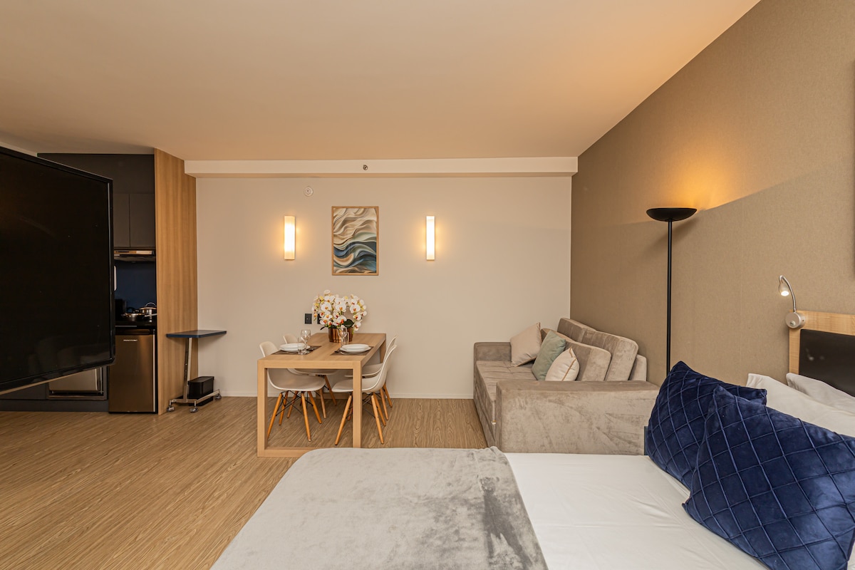 Appartament sħiħ f'Alphaville, ideali għax-xogħol jew għad-divertiment. Għandha kamra tas-sodda b'sodda doppja, arja kkundizzjonata u TV. Salott b'sufan, sett tat-TV u fann mas-saqaf. Il-kċina mgħammra b'cooker, forn, microwave, minibar u pożati. Il-Flat għandha wkoll magna tal-kafè Nespresso (kapsula waħda kull lejl), lożor, xugamani u tindif ta' kuljum. Għal żjarat itwal minn 6 iljieli, kull nhar ta' Ħamis se nagħmlulek il-ħasil tal-ħwejjeġ (sa 5 kg). Il-bini għandu pixxina, gym, sauna u suq li jibqa' miftuħ 24 siegħa kuljum.