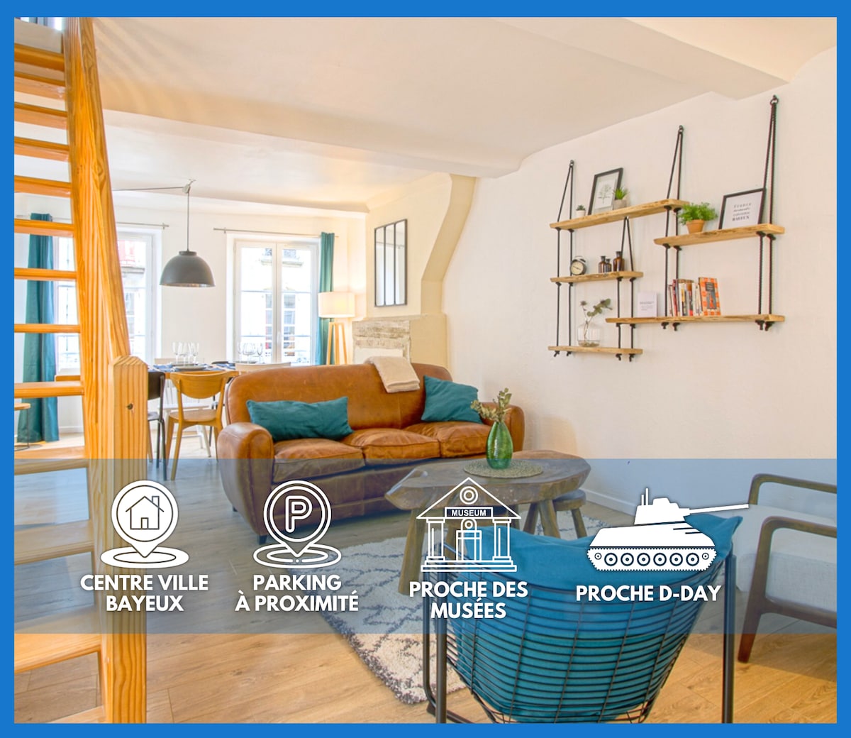Akkomodazzjoni sabiħa kompletament rinnovata fl-2018 fil-qalba tad-distretti storiċi ta 'Bayeux, 100 metru' l bogħod mill-katidral u tapizzerija Bayeux, li toffri kumdità ta' kwalità, servizzi riċenti u veduti ta' monumenti storiċi. Il-ħwienet jinsabu fil-qrib fil-qiegħ tal-bini u joffru l-possibbiltajiet kummerċjali kollha, kif ukoll is-servizzi kollha meħtieġa (bank, uffiċċju postali,saħħa eċċ.).