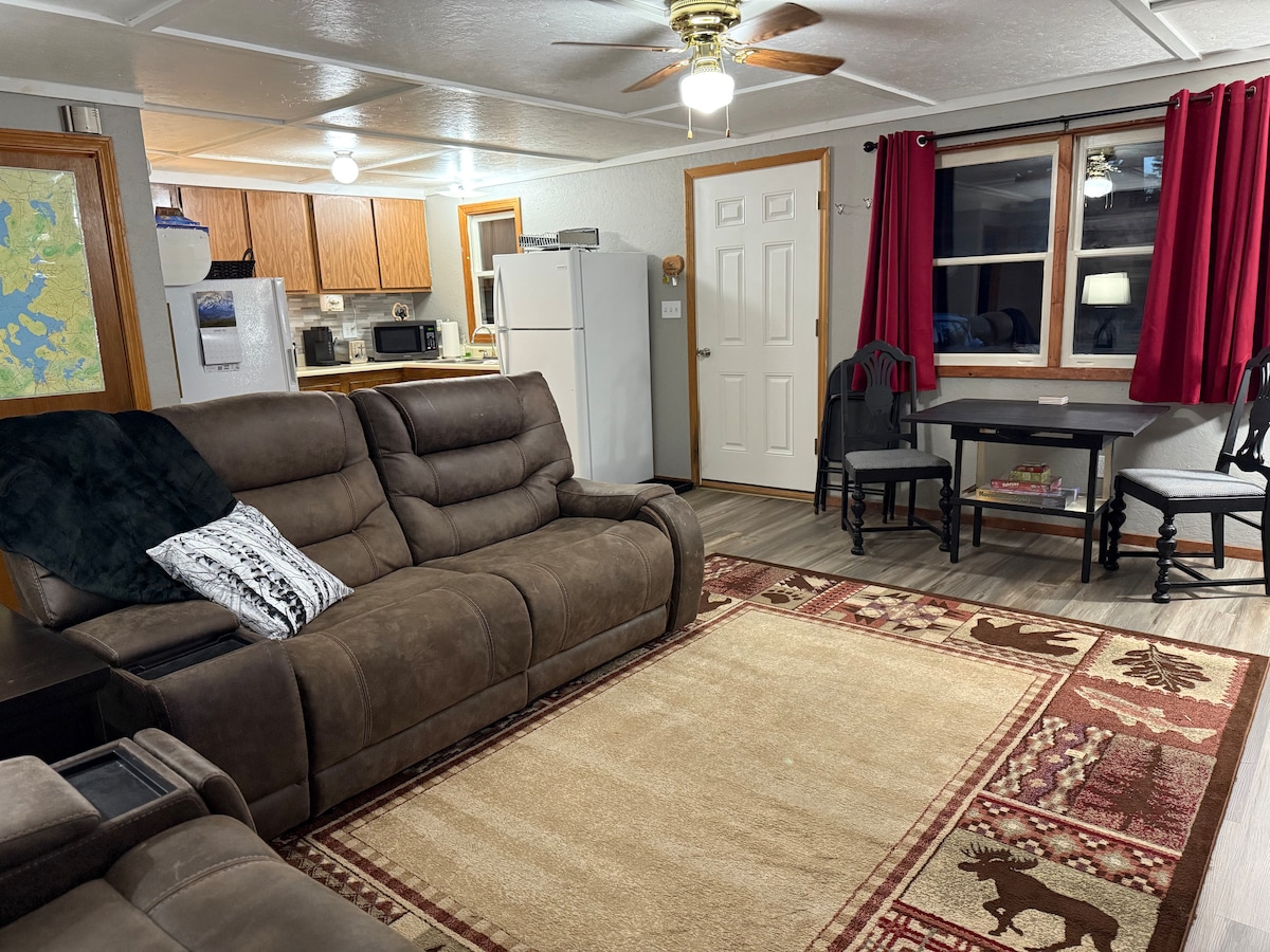 Il-privatezza u l-kumdità huma tiegħek meta toqgħod f 'din il-kabina spazjuża ta' erba' staġuni li toffri 3 kmamar tas-sodda, 2 kmamar tal-banju b' għadajjar privati tagħha stess. Il-kabina hija fornuta b 'lożor, xugamani, kċina mgħammra tajjeb, A/C, WiFi, skrinjata fil-porch, fireplace tal-blat komdu, mejda tal-pikniks, fossa tan-nar, grill u xenarju sabiħ. Ir-rata tinkludi sa 2 klijenti, kull klijent addizzjonali huwa $ 35.00/lejl. Il-pets huma milqugħa għal tariffa ta' $ 20 għal kull pet kuljum(mhux iktar minn 2) u l-injam tan-nirien tal-kampeġġ huwa disponibbli $ 5 kull pakkett.