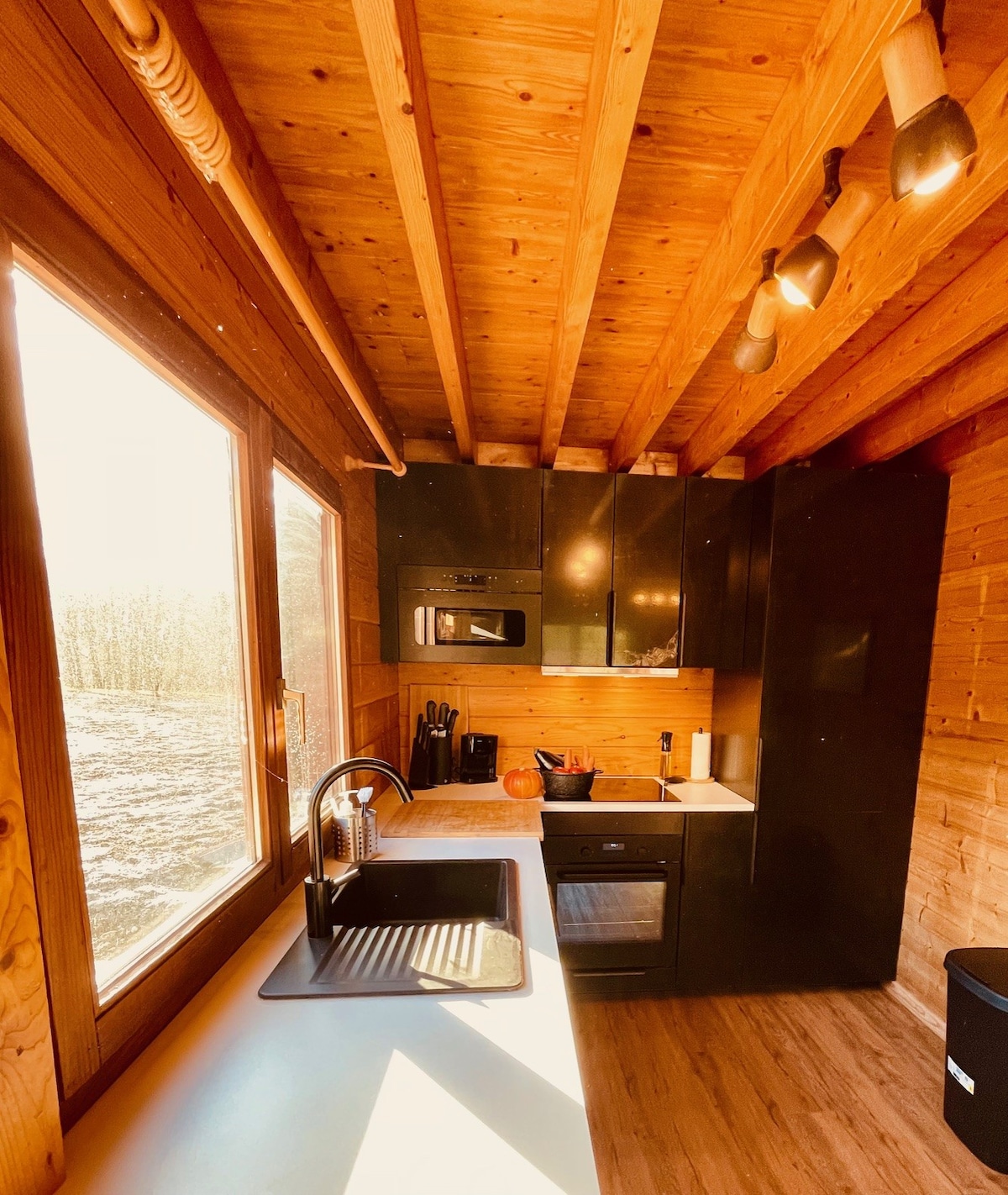 Chalet rilassanti f 'pajsaġġ paċifiku. Għal koppji, tfal u pets. Kċina mgħammra, stufi tal-injam, airco, kamra tas-sodda 1 b 'sodda doppja u veduta panoramika, kamra tas-sodda waħda b' żewġ sodod (taraġ wieqaf, minħabba l-forma trijangolari tal-cottage) + sufan sodda, kamra tal-banju, WiFi, Netflix. BBQ. Sawna fuq barra b 'veduta panoramika. Lest biex tiskopri n-natura. Kummerċjali megacentre 5 km 'il bogħod
