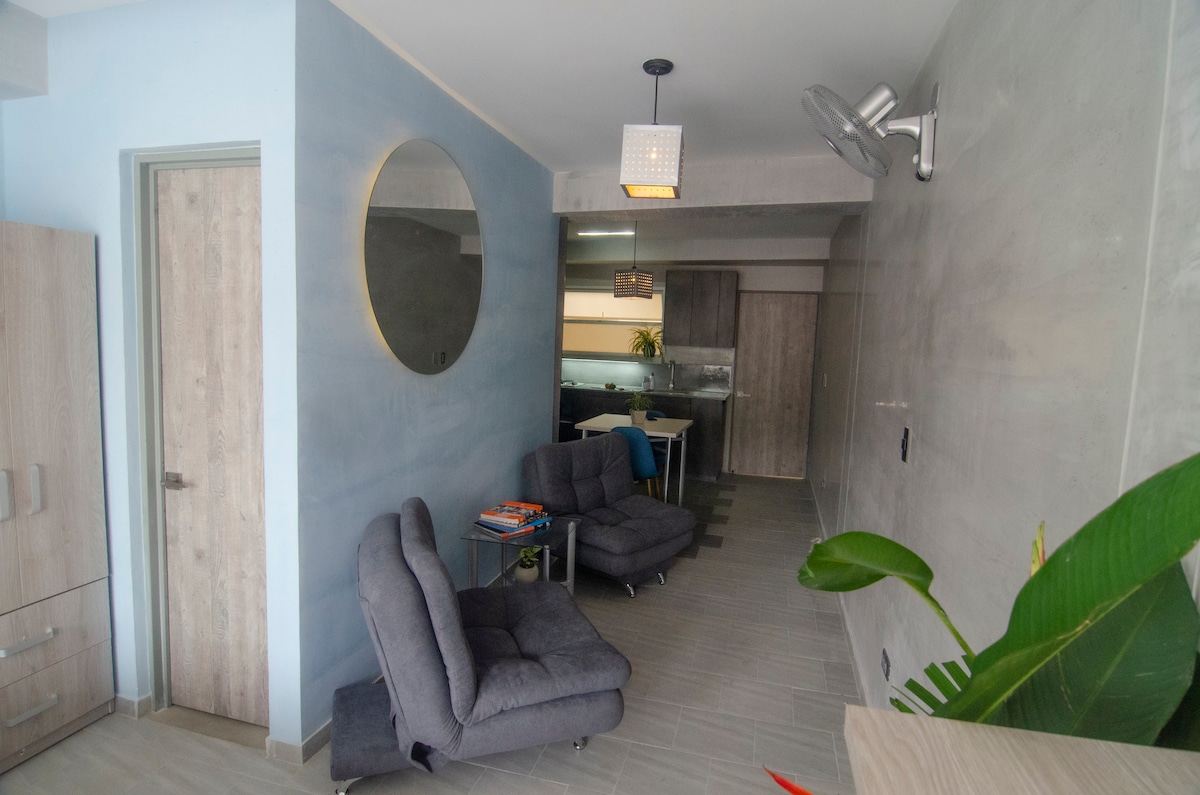 Encantador aparta-estudio ubicado en el corazón de cali. Cuenta con: CAMA QUEEN, colchón semi ortopedico, AIRE ACONDICIONADO, smart TV, ZONA DE TRABAJO, INTERNET DE ALTA VELOCIDAD, clóset. Baño completo, DUCHA CON AGUA CALIENTE. COCINA completa y dotada. SOFACAMA Cercano a las Canchas Panamericanas, Estadio Pascual Guerrero, centros comerciales como Palmetto Plaza, Mallplaza, Cosmocentro y a las principales clínicas de la ciudad como Imbanaco y Farallones.