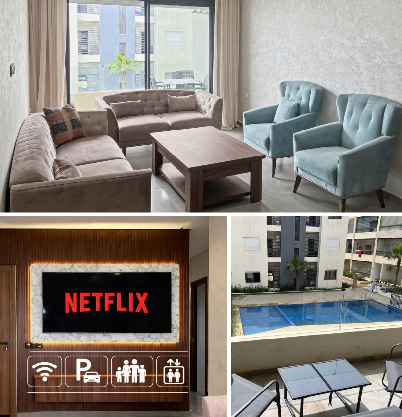 Appartament kwiet ,niexef , nadif u xemxi matul il-ġurnata kollha,konvenjenti u modern ideali għal dawk li qed ifittxu rilassament u kumdità L-appartament jinsab f'Bouznika, il-belt tal-mikroklima eċċezzjonali. Ristorant fil-qrib. 5 minuti 'l bogħod mill-bajja u l-istazzjon tal-ferrovija. Residenza sigura. 2 pixxini kbar u ħafna ħaxix u ġnien miżmum tajjeb Checkin u check-out flessibbli Persuna li tieħu ħsieb id-dar disponibbli fuq talba