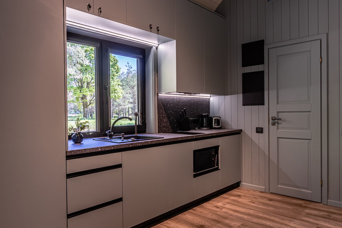Dar tal-foresti privata u moderna ħafna b 'jacuzzi b' xejn u grill Kamado. Il-post huwa ideali għall-koppji, madankollu huwa possibbli li jġibu lit-tfal. Id-dar hija mdawra b 'foresta, hemm razzett taż-żwiemel fil-qrib. Plateliai lake jekk ftit minuti mixi 'l bogħod.