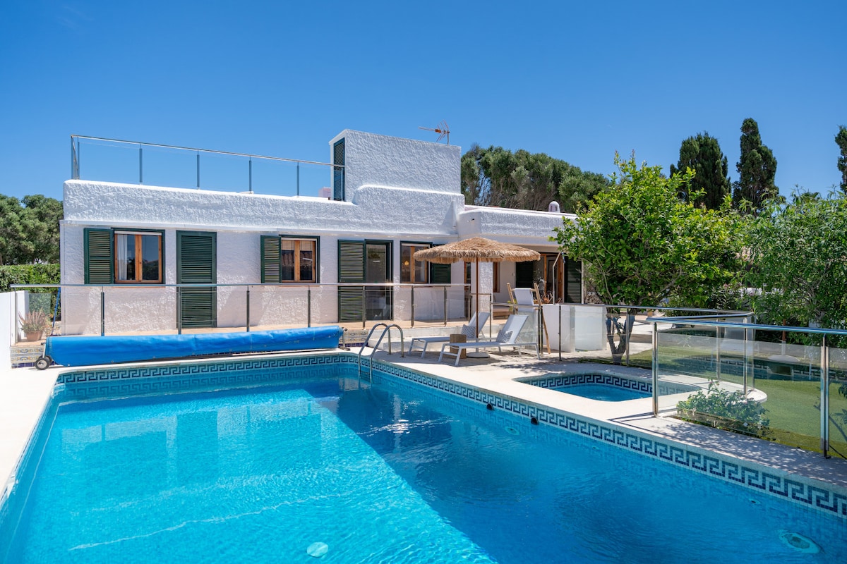 Maison construite en 2000 dans le style minorquin avec une grande terrasse donnant sur un beau jardin et une piscine vue mer. 4 chambres dont 2 suites parentales avec leur propre salle de bain et une grande salle de bain partagée par les 2 autres chambres. Nombreux rangements. Vaste séjour donnant sur la terrasse. Rue très calme dans la verdure à 400m de la mer et 3 en voiture du ravissant village de Binibeca Vell. La maison est entièrement équipée.