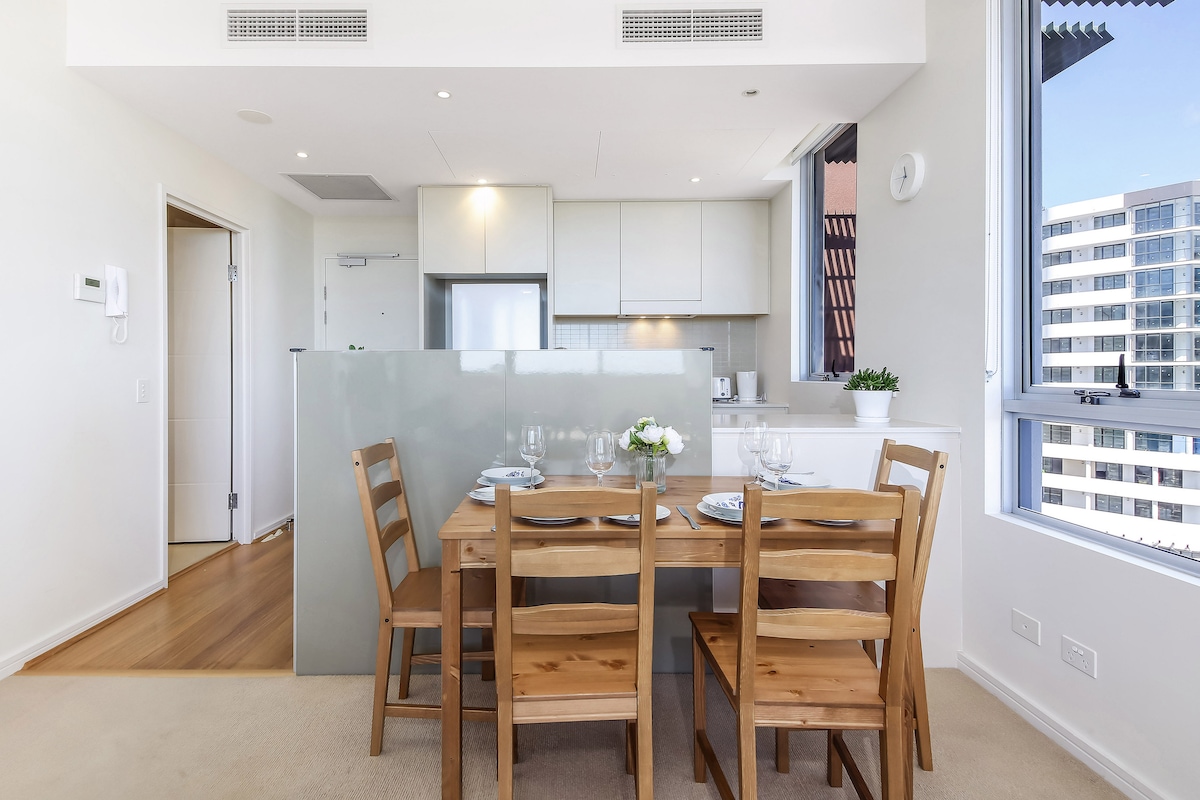 Tajjeb għal żjara, bħala alternattiva għax-xogħol mid-dar, jew għall-familji. Appartament ta 'livell għoli b' veduta tal-belt u parkeġġ ta' 2 karozzi. Livell għoli b 'veduta espansiva tal-belt. Woolworths tinsab 'l isfel. Biss 5 minuti mixi mill-istazzjon tal-ferrovija.2 kmamar tas-sodda t-tnejn b' 2 sodda doppja' Queen' n iġbed is-sufan. Twieqi li jħarsu lejn il-belt sabiħa lejl u nhar. Pixxina u Gym fil-bini. Distanza bil-mixi sa Westfield Shopping Centre, Supermarkets n 100+Restaurants.20mins sa Sydney CBD bil-ferrovija.
