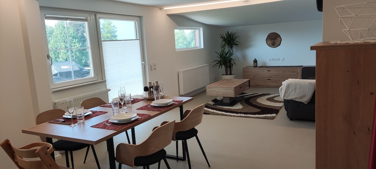 Appartament komdu ħafna u mgħammar tajjeb b 'Flat-TV, WLAN tal-fibra tal-ħġieġ u kamra tal-banju kbira. Kċina mgħammra kompletament b 'magna tal-ħasil tal-platti, forn, eċċ. L-appartament jinsab fil-kantina (6 passi 'l isfel iżda ħafif ħafna), iħares lejn in-Nofsinhar, xemxi, kwiet, b' daħla separata għall-privatezza mingħajr xkiel. L-appartament għandu ġnien/park tal-logħob ta' 1.000 m2 fejn it-tfal, il-klieb u l-adulti jħossuhom id-dar 'il bogħod mit-traffiku. Aċċess bla ħlas għall-uffiċċju tal-komunikazzjoni tagħna fid-dar tal-ġar.