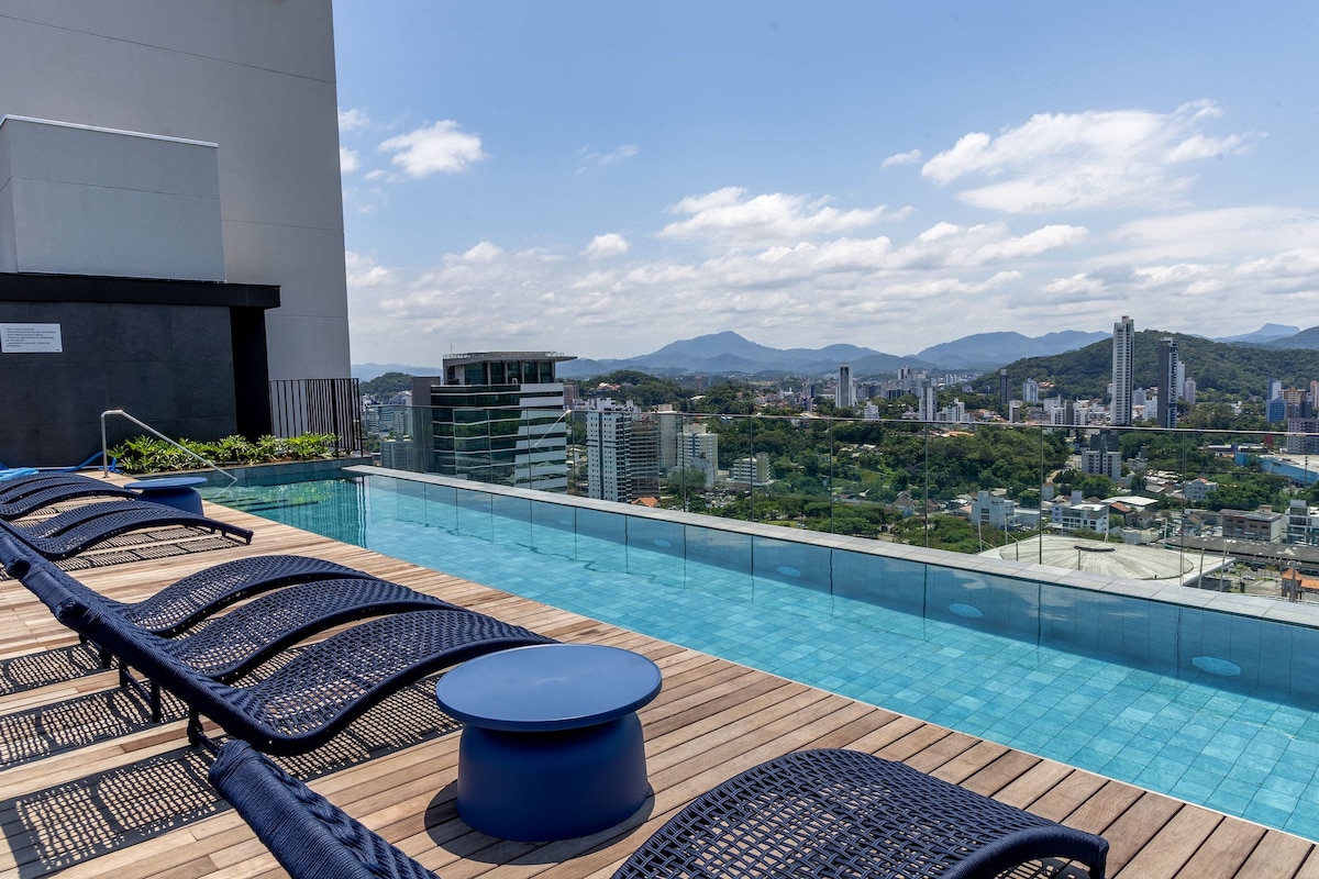 Moderno studio fiċ-ċentru ta' Blumenau, qrib FURB u Vila Germânica. Mgħammra b' sodda Queen, Wi-Fi, arja kkundizzjonata, Smart TV, kċina sħiħa (friġġ, cooker, microwave, magna tal-kafè u għodod) u kamra tal-banju b' hairdryer u xugamani. Il-bini joffri pixxina infinity, gym, coworking lounge, pub, żona ta' divertiment u ħasil tal-ħwejjeġ self-service. L-ispazju tal-garaxx inkluż. Bliet Tindif fil-ħin taċ-checkout, b' għażla ta' tindif addizzjonali. Gawdi l-kumdità u l-konvenjenza kollha!