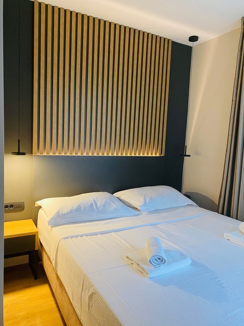Our humble establishment offers five apartments featuring the same setup, each 4* apartment is for 4+2 guests, with 2 bedrooms, 2 bathrooms, kitchen, balcony, living room with sofa bed and access to pool and private beach. Plenty of outdoor relaxation and activities space with a basketball court, ping-pong table and small gym. Free use for all guests of covered outside kitchen with BBQ grill and oven as well as covered private parking. Daily breakfast and weekly dinner is included in price.