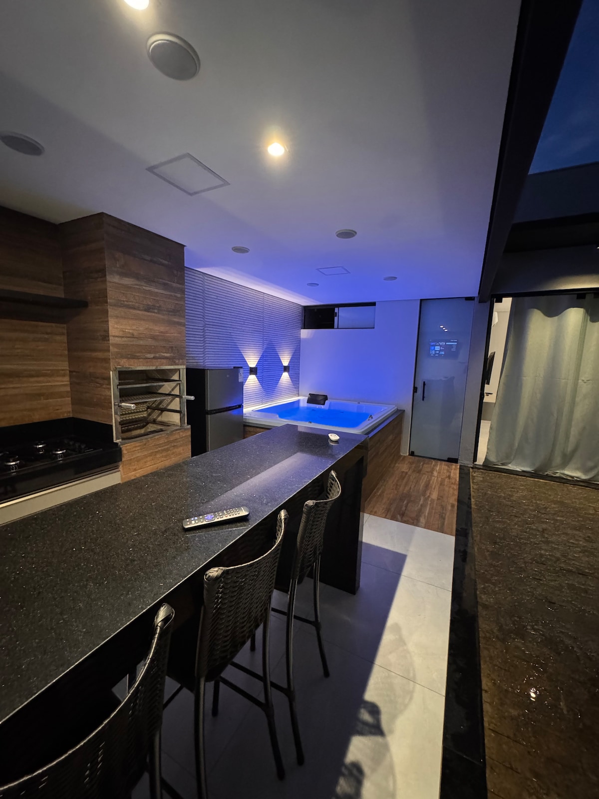 Acomodação moderna com suíte aconchegante, cama confortável e iluminação decorativa. Sala com TV e ar-condicionado. Área gourmet completa com bancada, cooktop e TV adicional. Espaço externo com jacuzzi iluminada, ideal para relaxar. Ambiente elegante, integrado e perfeito para descanso e lazer.