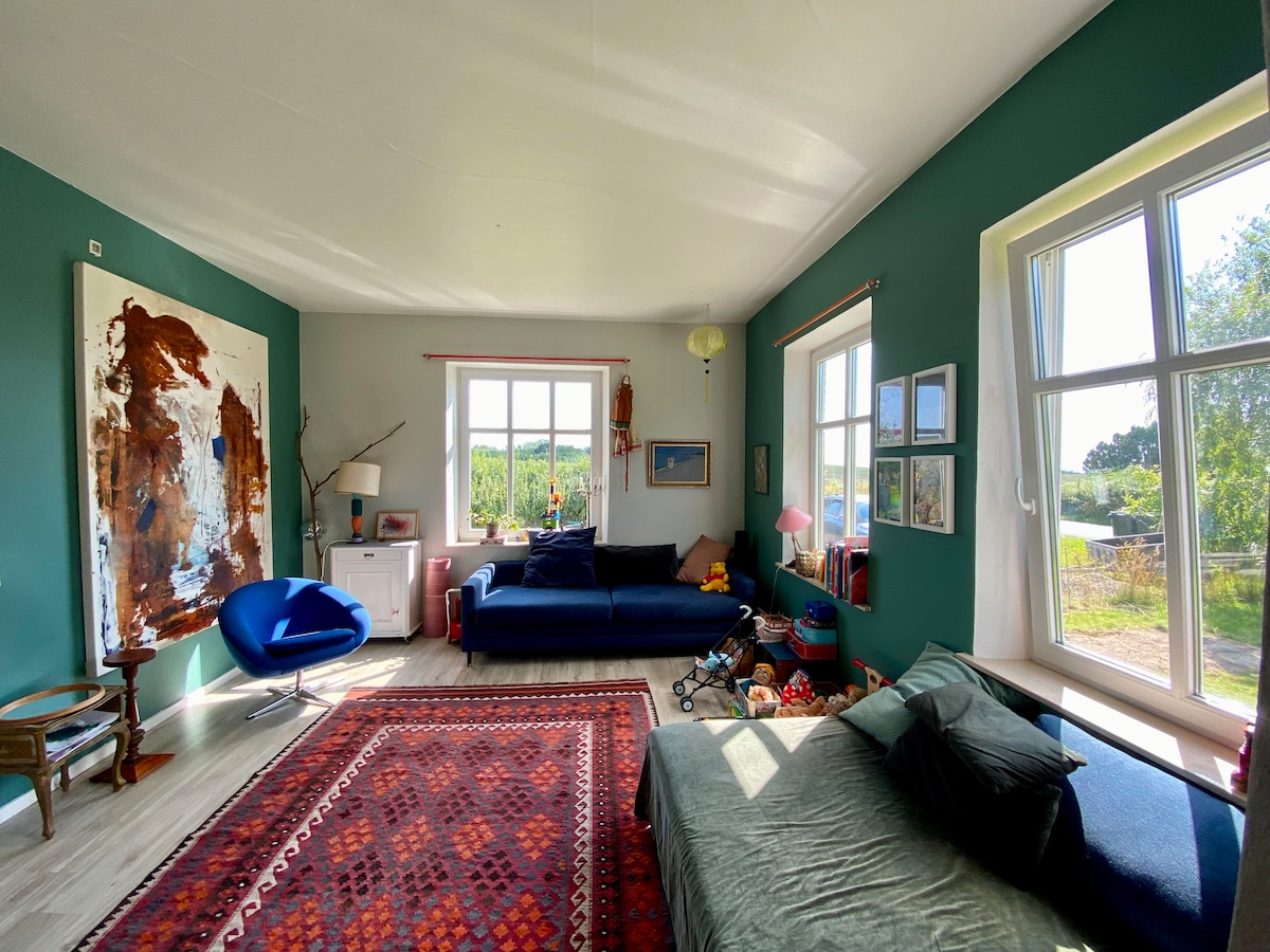 Il-guesthouse tagħna ta' 100 m² tinsab fil-qalba tal-kampanja ta' Møn – parti minn żona naturali tal-Wirt Dinji tal-UNESCO u waħda mill-postijiet uffiċjali tas-Sema Skur tad-Danimarka. Hawnhekk, il-ħajja tonqos, il-veduti jestendu sal-orizzont, u kull staġun għandu l-maġija tiegħu stess. Kemm jekk iżżur fid-dawl twil tas-sajf kif ukoll matul l-istaġuni iktar skuri għall-arja friska u għall-istilel, id-dar toffri kumdità, kalma u spazju għal kull età.