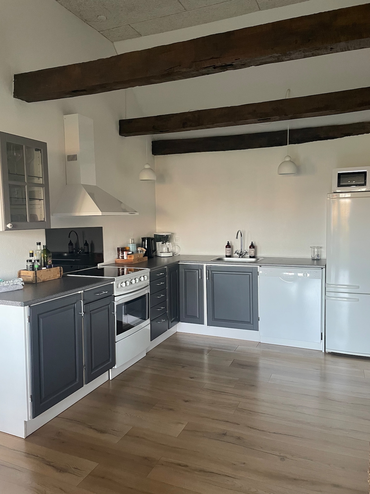 Cosy guest house, which is an independent building on the old school . The flat is 51m2 and has a lovely south-facing private 28m2 terrace. Combined kitchen and living room, a toilet/bath, an entry hall and a bedroom with one queen size bed and two bunk beds. The terrace is furnished with garden furniture, and there is wifi, tv, cromecast and parking near the entry door. Two extra beds can be made in the living room. Bonfire hut, tarzan track, hammocks and a large garden with playground.