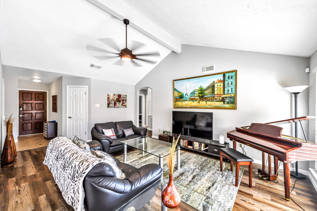 Suite Komda għall-Klijenti b' Hardwood Floor u Kumditajiet Moderni. Champion Suite tinsab f 'komunità sigura ta' korsijiet tal-golf; u tgħaqqad il-kumdità u l-konvenjenza ma' karatteristiċi bħal: - Art tal-injam iebes - Kċina mgħammra b' kollox - Magna tal-kafè Nespresso - Xawer bil-mixi - Stazzjon tax-xogħol - Magna tal-ħasil u Dryer - 2 smart TVs - Fubo TV, Netflix, Disney+ - Wi-Fi b' veloċità għolja - Sodda King - Żona Komda tal-Għajxien - Central A/C & Heater Jinsabu b 'mod konvenjenti 20 minuta' l bogħod min-NASA, 25 minuta' l bogħod miċ-ċentru ta' Houston.