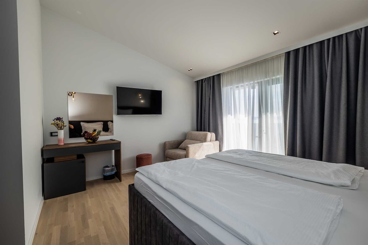 Enjoy your stay at Casa Benita Hvar, a guesthouse designed for relaxed, modern island living. Each morning, enjoy a fresh breakfast delivered to your room — INCLUDED in the price. Unwind in a cozy double bed with Netflix TV, a stylish make-up mirror and an in-room bathtub. Your private balcony with seating offers a peaceful spot to unwind with a partial view of the sea. This studio also features a fully equipped kitchen with an island, perfect for cooking during your stay.
