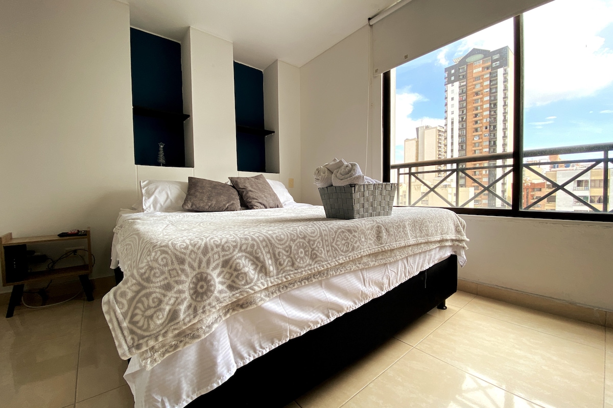 Relájate en este tranquilo y elegante apartaestudio renovado completamente por su suscrito anfitrión Super host de Airbnb. En la mejor ubicación de la ciudad, cerca a los mejores restaurantes y bares de la ciudad. En sus 39 mts2 puedes contar con moderna cocina Dotada con todo lo necesario para tu estancia, cómoda sala con amplio sofa , barra de desayuno, escritorio y silla, amplia habitación con cama matrimonial, smartv 40", ventilador, balcon y baño privado con agua caliente.