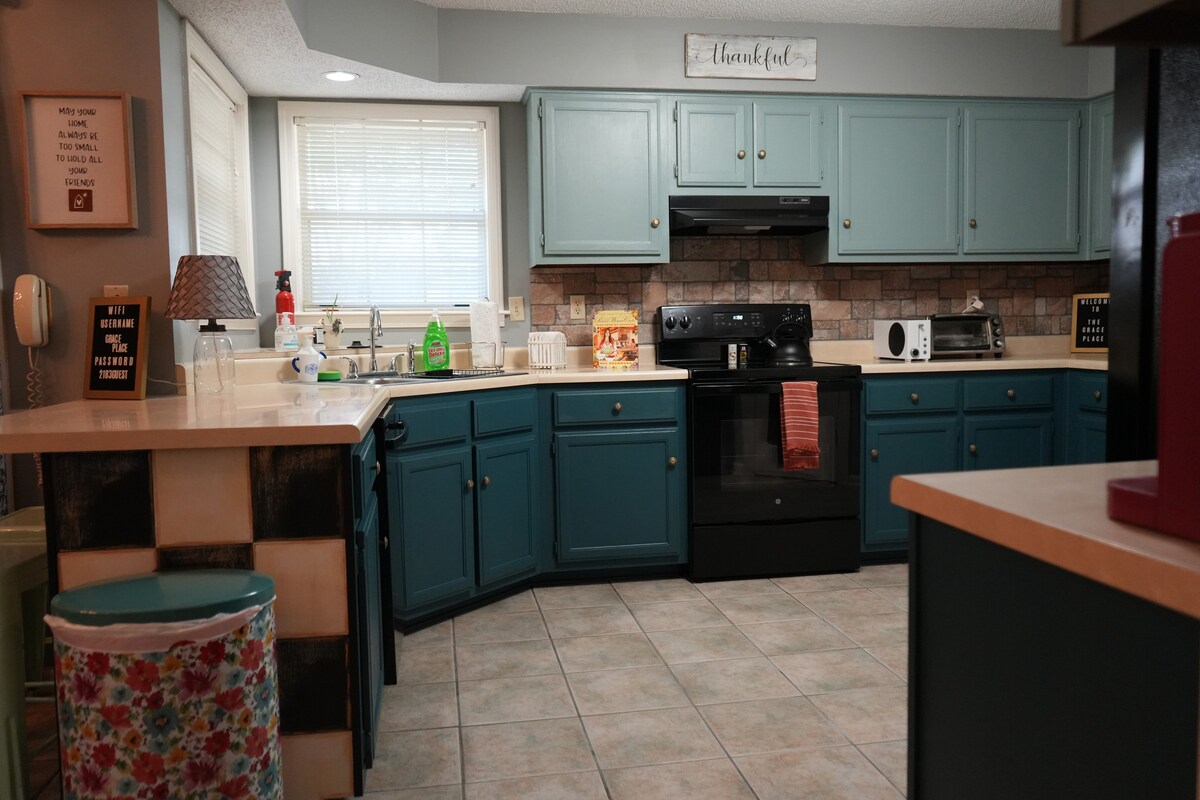 ~Rinnovat Ġdid ~ Terrazzin Komdu w/ Grill ~Wifi ~Disinn Stylish ~8 min lejn l-Ajruport ~19 min lejn Beale Street/Sun Studios/Mużew Nazzjonali għad-Drittijiet Ċivili ~11-il minuta sa Gra Iceland ~12-il minuta sa Liberty Bowl ~Parkeġġ kopert Dar 3bd/1b fil-viċinat mixtieq East Memphis. Ċentrali għal ristoranti, attrazzjonijiet u ajruport. Kċina mgħammra b 'kollox, kmamar tas-sodda komdi, dekorazzjoni li tilqgħek, diversi spazji fejn tgħix u bitħa kompletament magħluqa. Stash tal-logħob lest għall-lejl tal-logħob! Ideali għall-vaganza ta 'tmiem il-ġimgħa jew għal żjara fit-tul!
