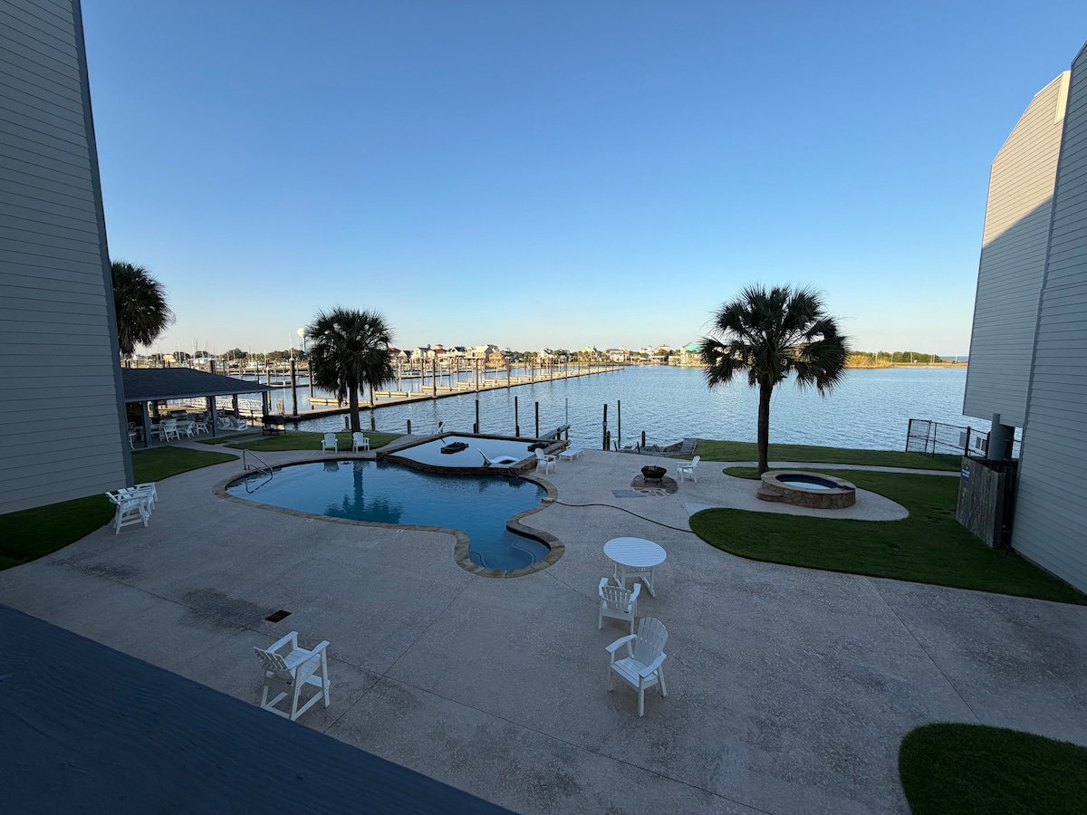 Din il-conddo faċċata tal-ilma, li tinsab ġewwa Pleasure Island Marina, toffri veduti mill-isbaħ u aċċess faċli għal Sabine Lake. L-unità tat-tielet livell, b' aċċess għal-lift, jorqdu erba' persuni. Il-kamra tas-sodda għandha sodda queen u kamra tal-banju tal-kuritur, filwaqt li ż-żona tas-salott għandha sufan irqad queen, purtieri blackout u TV intelliġenti ta' 75 pulzier bil-WiFi u l-cable. Il-kċina tinkludi rokna fejn tiekol, postijiet fejn toqgħod bilqiegħda u spazju fejn tista' taħdem bil-ħwienet. Irrilassa fuq il-gallarija privata b' postijiet bilqiegħda b' għoli ta' bar u veduti tal-marina mill-isbaħ!