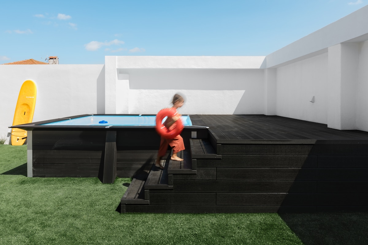 Irrilassa fuq il-gverta tal-pixxina xemxija. Tajjeb għat-tfal