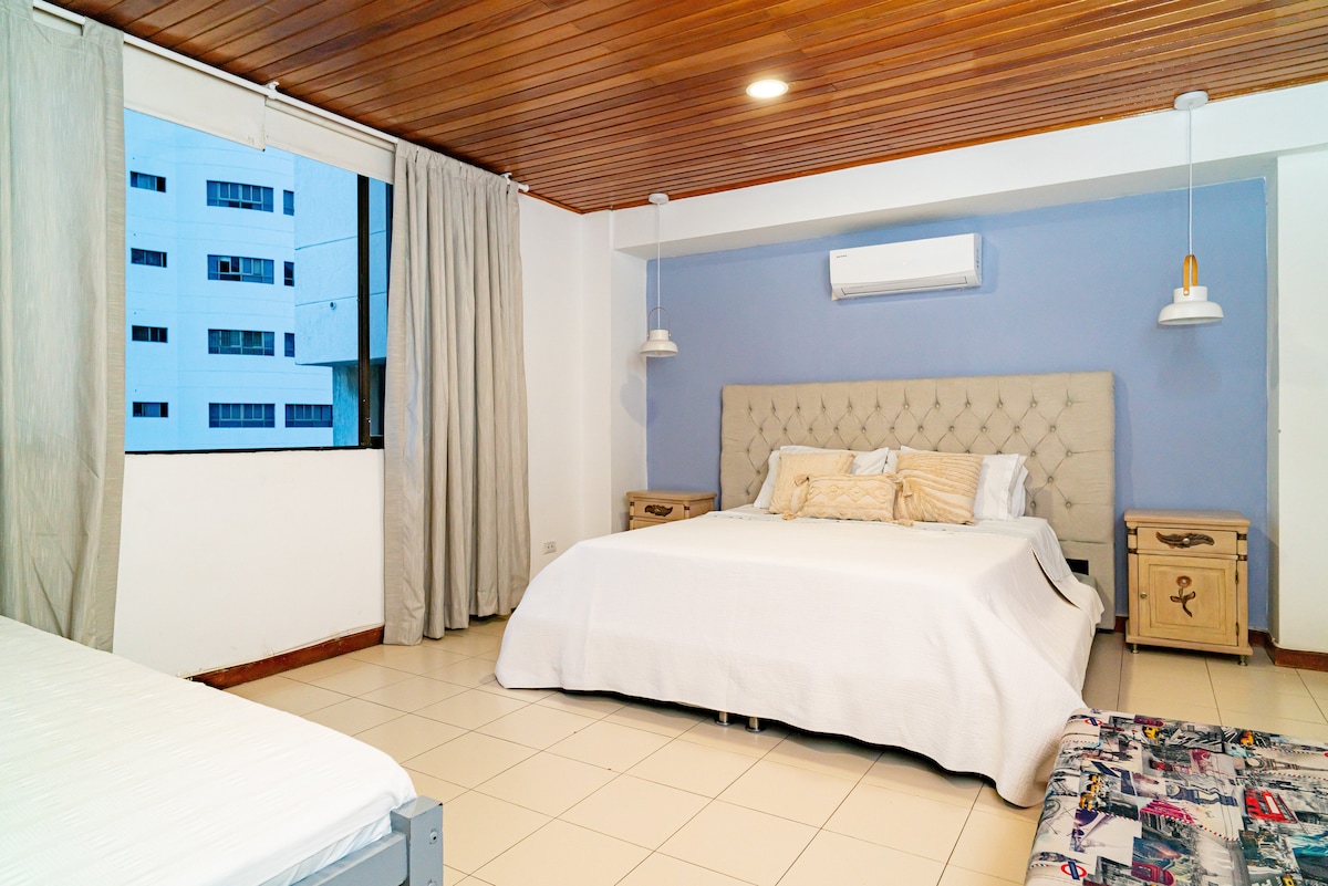 Habitación ideal para familias o grupos pequeños. Cuenta con una cómoda cama doble y una cama auxiliar individual, perfecta para un tercer huésped. Espacio moderno, con aire acondicionado, baño privado y todo lo necesario para una estadía confortable.