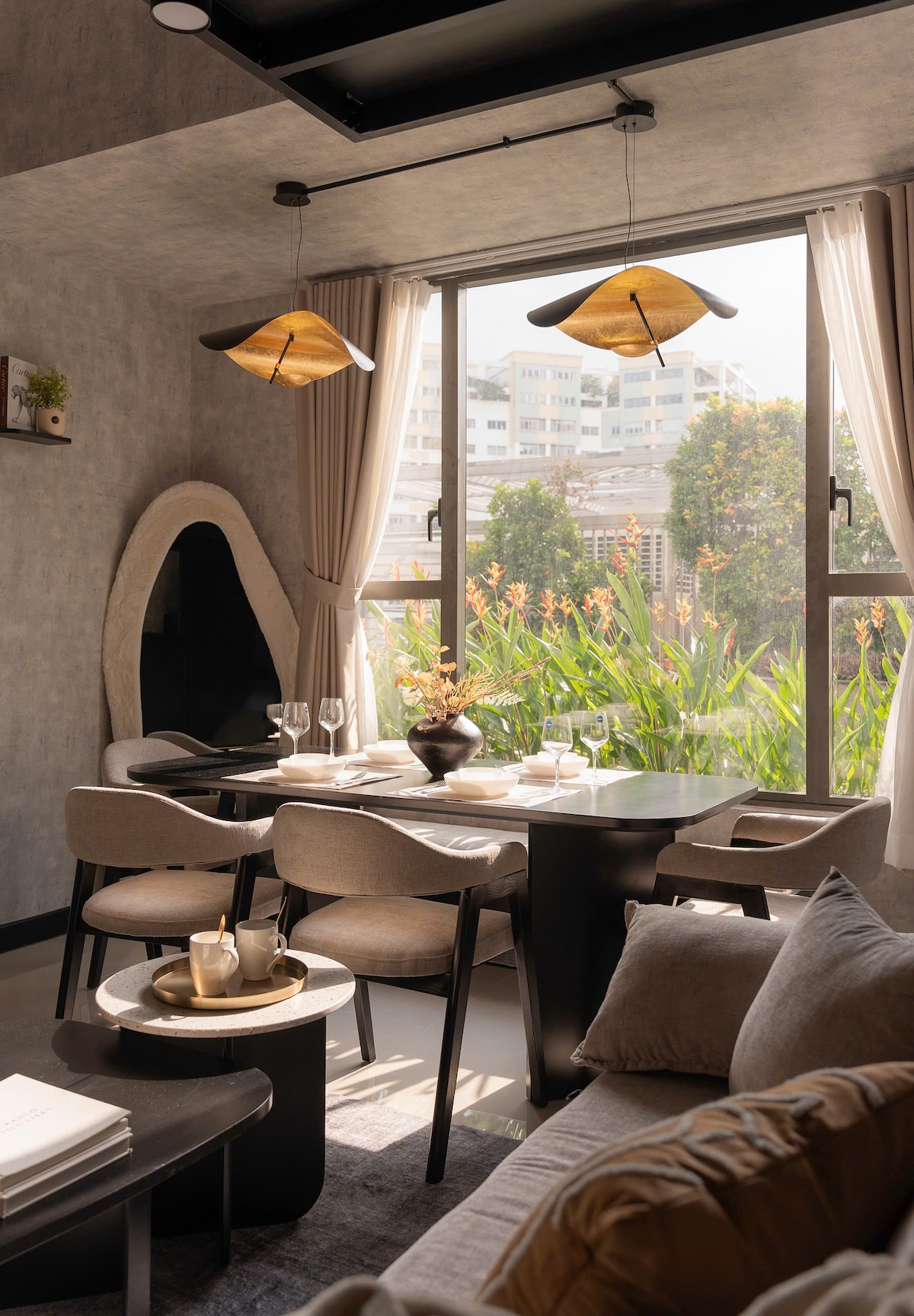 L-appartament huwa ddisinjat b' mod sabiħ fi stil Wabi Sabi li jinsab fil-bini D1Mension Residences, fiċ-ċentru tad-Distrett 1, stil tal-arti, faċilitajiet speċjali ta' resort ta' livell għoli_spa bath lake_sauna, gym_kamra tal-laqgħat, kamra tax-xogħol privata, għadira tal-ħut tal-ġnien, piza 4P quddiem il-bini, żona tal-BBQ tal-ġnien, żona tal-logħob għat-tfal, salott kbir, it-twieqi u l-gallarija tal-kamra tas-sodda kollha huma arjużi, uniċi, lussużi u ta' stil.