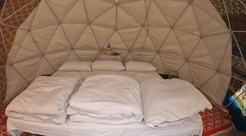 Immaġina li tqum għal veduti mill-isbaħ tal-Himalayan ġewwa Jibhi, Himachal Pradesh. Id-dar b' koppla ġeodiżika lussuża tagħna, "The White Pearl", toffri esperjenza ta' glamping bla preċedent. Din id-dar b' koppla ekoloġika għandha spazju wiesa' fejn toqgħod b' LED TV, friġġ żgħir, wifi, kitla tal-elettriku u postijiet komdi fejn toqgħod bilqiegħda. Gawdi minn kumditajiet tal-ogħla livell ta' żvilupp tekniku, fosthom cum AC imsaħħna ċentralment, kamra tal-banju lussuża u Jacuzzi rilassanti b' faċilità tat-tisħin. Ideali għal vaganza romantika ġewwa The Himalayas.